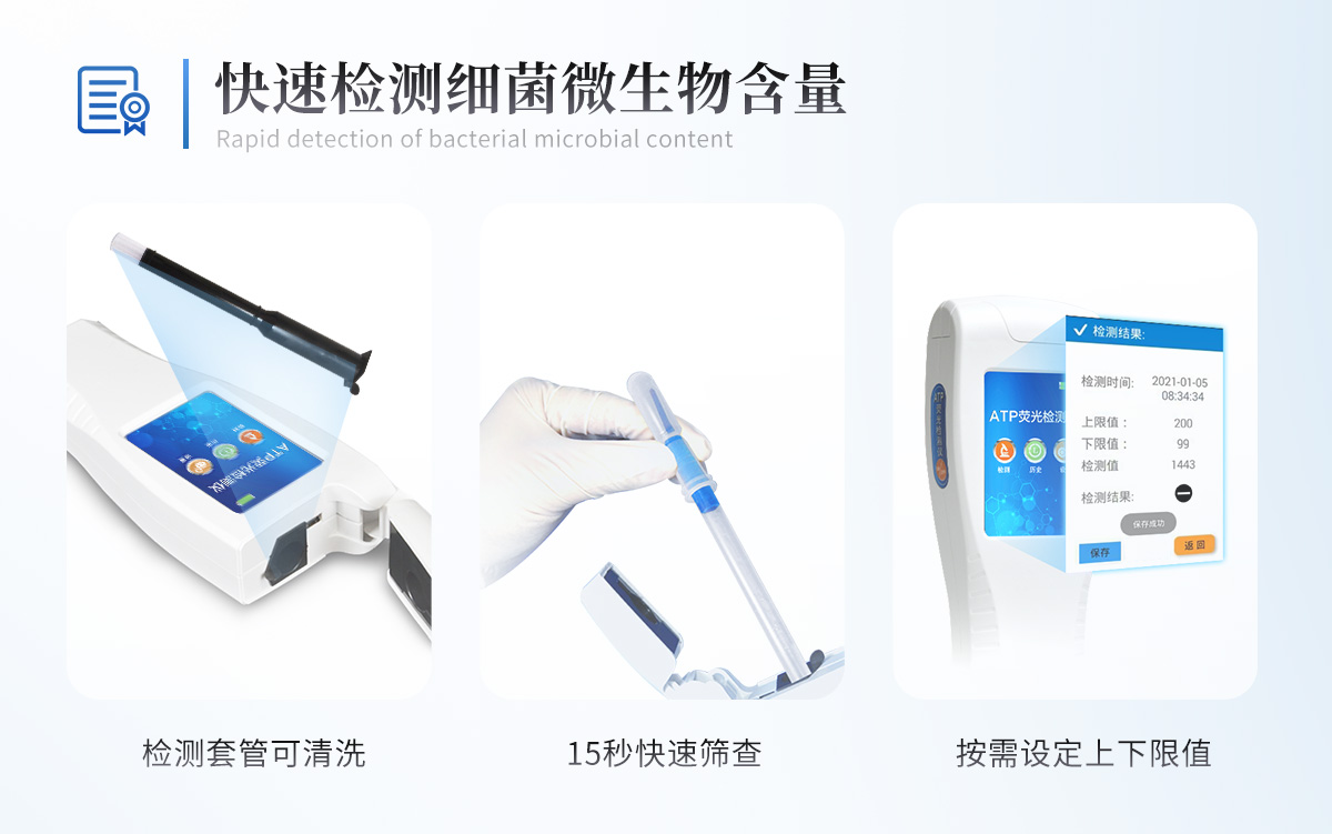 實用性 —— 可根據環境檢測需求設定上下限值,做到數據快速評估預警,表面潔凈度快速篩查。靈敏度高 —— ***************速度快 —— 常規培養法18-24h以上,而ATP只需要十幾秒鐘 .可行性 —— 微生物數量與微生物體內所含ATP有明確的相關性。 通過檢測ATP含量,可間接得出反應中微生物數量可操作性 —— 傳統培養方法需要在實驗室由經過培訓的技術人員進行操作;而ATP快速潔凈度檢測操作非常簡便,只需簡單的培訓即可由一般工作人員進行現場操作。體驗更好 —— 試子套管采用插拔式靈活設計,可定期清洗長期使用,延長儀器壽命。