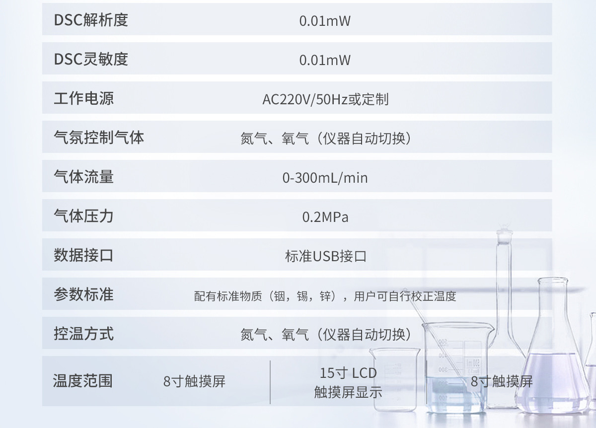 1.溫度范圍: -150~500℃ (根據制冷設備確定**溫度) 2.溫度分辨率: 0.01℃ 3.溫度波動: ±0.1℃ 4.溫度重復性: ±0.1℃ 5.升溫速率: 0.1~100℃/min 6.恒溫時間:建議<24h 7.控溫方式:升溫,恒溫(全自動程序控制) 8.DSC量程: 0~±600mW 9.DSC解析度: 0.01mW 10.DSC靈敏度: 0.01mW 11.工作電源: AC220V/50Hz或定制 12.可選冷卻設備: - 壓縮空氣冷卻(-AR):RT ... 500℃ - 機械制冷(-MR): -40 ... 500℃ - 液氮制冷(-LN):-150 ... 500℃ (可以單獨或同時連接多種冷卻裝置) 13. 氣氛控制氣體:氮氣、氧氣(儀器自動切換) 14.氣體流量:0-300mL/min 15.氣體壓力:0.2MPa 16.顯示方式: 24bit色,8寸 LCD觸摸屏顯示 17.數據接口:標準USB接口 18.參數標準: 配有標準物質(銦,錫,鋅),用戶可自行校正溫度