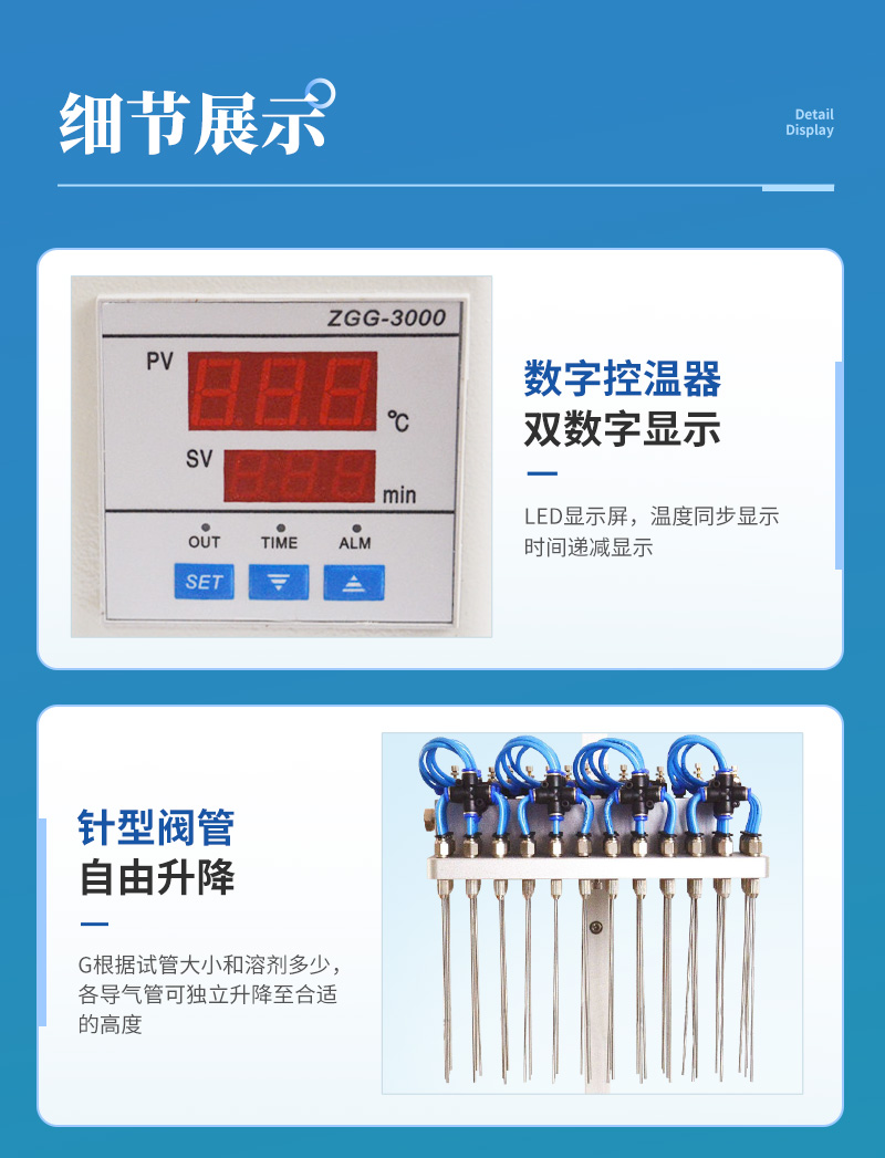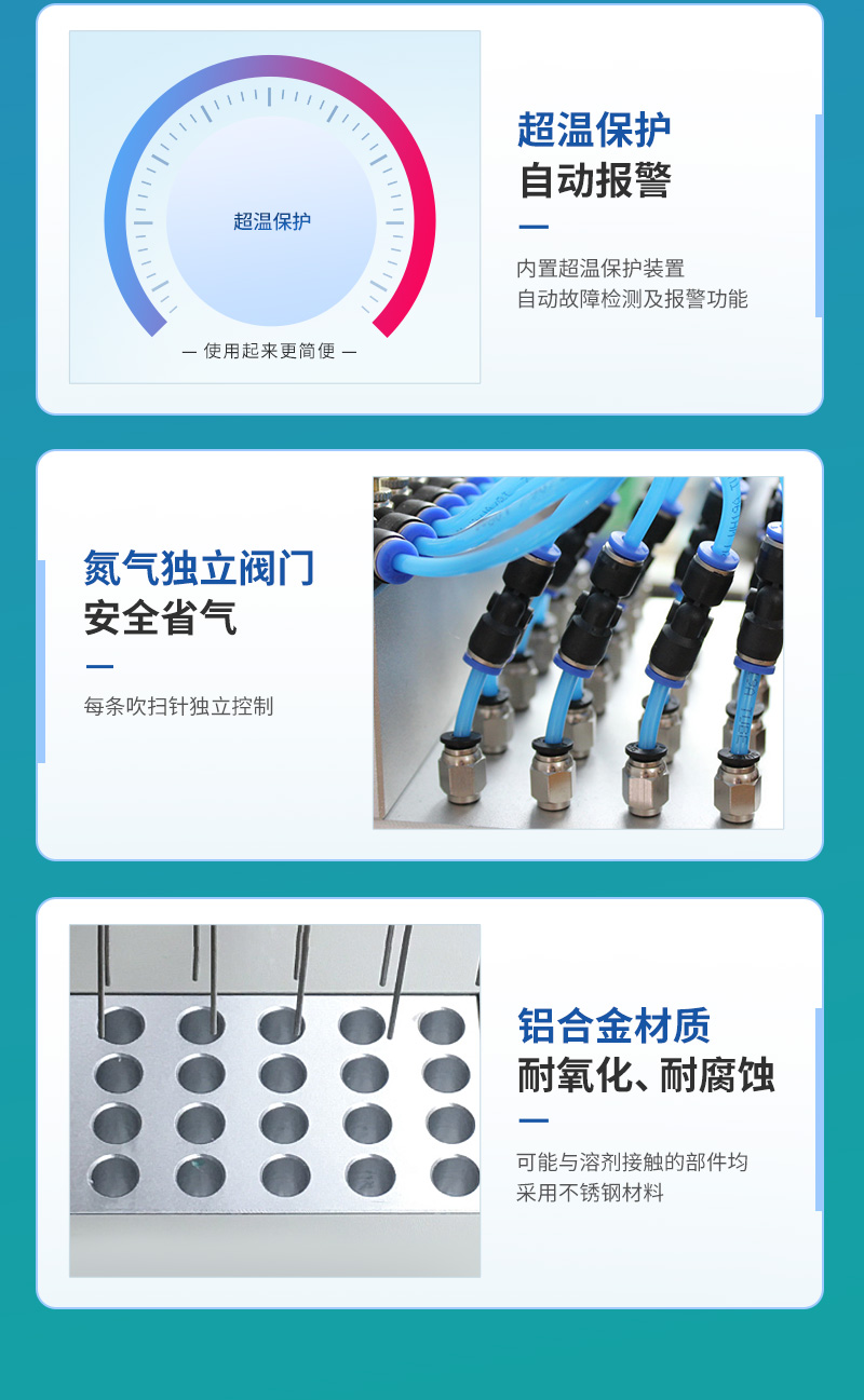 2、每一路氣體流量可單獨進行調節,克服了不可調氮吹儀各氣路氣流量大小不一的弱點。