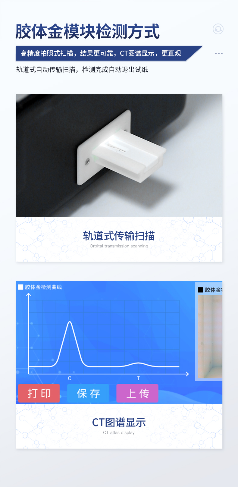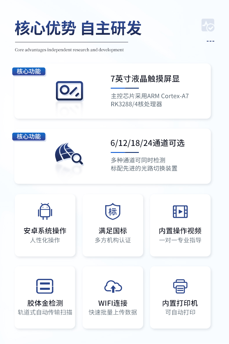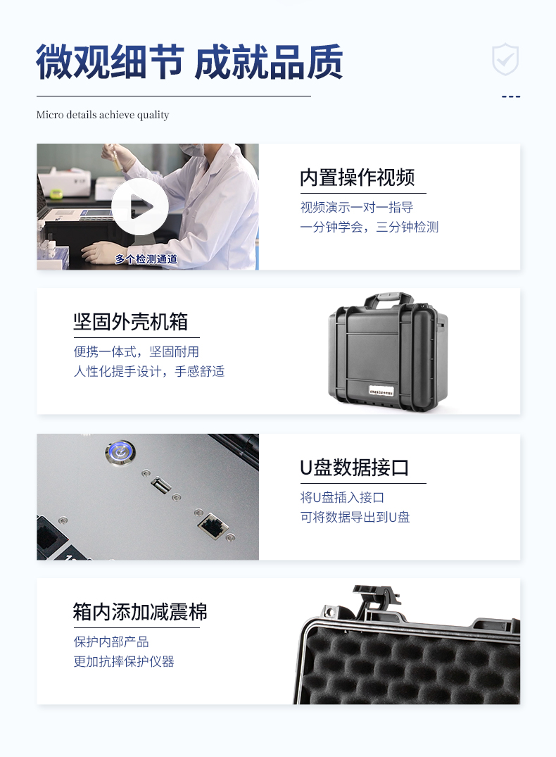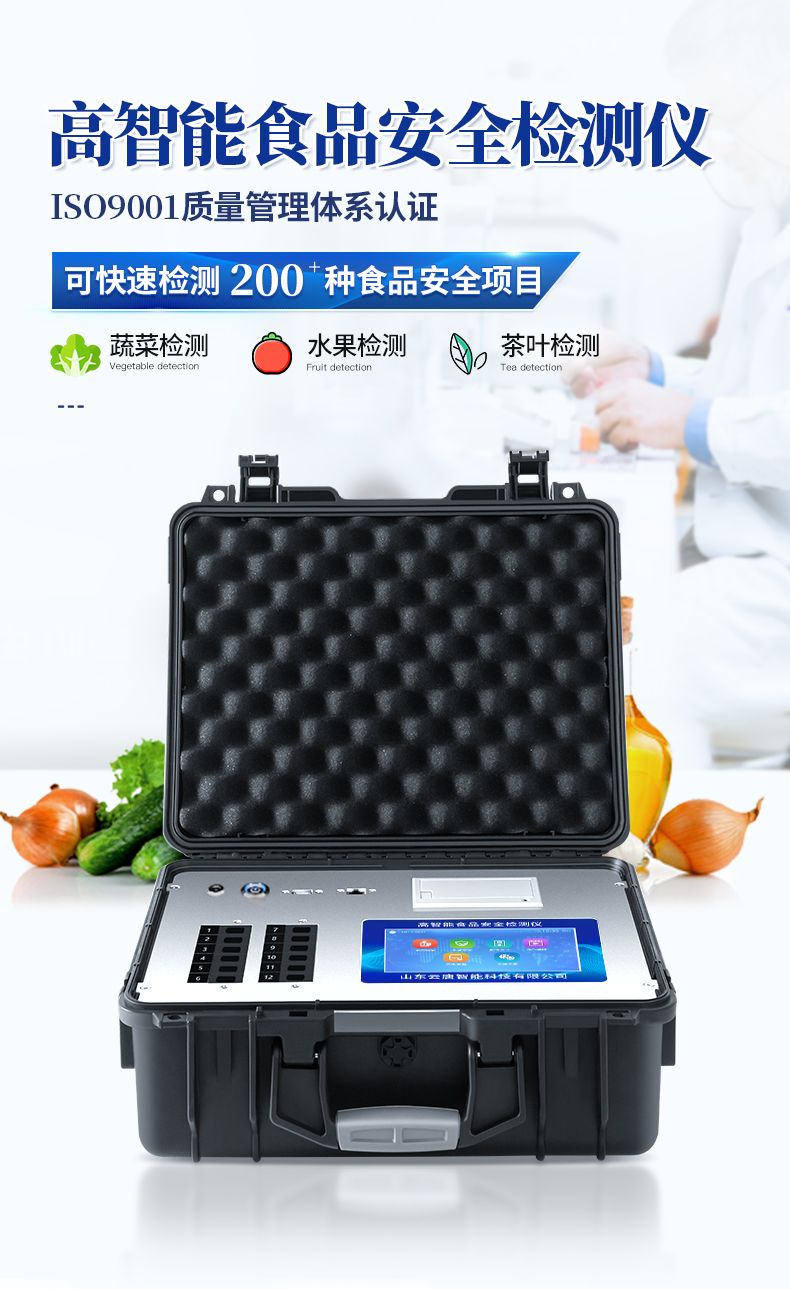 | ★安卓智能操作系統,采用更加**UI交互界面,儀器具有wifi聯網上傳、4G聯網傳輸、GPRS無線遠傳、網線連接功能,快速批量上傳數據。 | 智能化程度高,儀器具有自檢功能:具有開機自檢和調零功能,具有自動檢測重復性功能。 | 一體化主機,包含食品安全檢測模塊、多通道農藥殘留檢測模塊、膠體金免疫層析檢測模塊。 | 一體化便攜式快檢設備,滿足現場及流動檢測使用需求,能夠在同一軟件下實現所有檢測項目的檢測,并可通過同一窗口直觀顯示檢測結果。 | ★比色池帶有控溫功能,可以升降溫度,優化了前處理過程,并且有效補償環境影響保證檢測結果 | ★儀器帶有監管平臺,數據可局域網和互聯網數據上傳,檢測結果直接傳至食品安全監管平臺。進行區域食品安全監管及大數據分析處理與數據統計,檢測區域食品安全長短期動態,達到食品安全問題預估、預警 | 膠體金檢測模塊,軌道式自動傳輸掃描,檢測完成后自動退出檢測卡。 | ★儀器內置攝像頭拍照,可顯示金標卡實時圖像,系統自動分析并呈現出CT坐標曲線圖,CT線自動識別,無需手動調整。 | 內置強大的數據庫,具有多品類多種類樣品菜單功能,可靈活選擇檢測樣品,不同的檢測通道可同時檢測不同的樣品項目。也可在儀器上直接編輯錄入樣品名稱、檢測指標、送檢單位等信息并保存進樣品數據庫。 | ★儀器內置操作視頻,點擊視頻模塊即可快速學習,是您身邊的化驗指導專家。 | 樣品處理簡單省力,整體操作快速、安全、便捷。 | ★儀器可配置身份識別功能,通過密碼或刷證件開機,防止非工作人員操作等。 | 新一代高速熱敏打印機,檢測完成可自動打印或批量打印檢測報告和二維碼。 | 高靈敏度,高檢測精度,高重復性精度,掃描式高精度光學傳感器。 | 儀器具有重新校準、鎖定、恢復出廠設置功能。 | 結果判定線可修改,對照值標定值可保存,斷電不丟失數據。 | 兼容市場上所有的膠體金卡,使用耗材不受限制,極大增強用戶使用體驗。 |