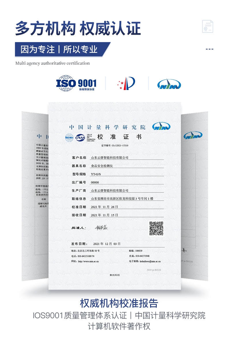 | ★廠家須有食品安全檢測知識產權管理體系認證證書 | ★廠家具有高新技術企業認證 | ★儀器具有食品安全轉件著作權 | ★儀器具有國家級計量研究院出具的計量報告 | ★試劑具有國家級計量研究院出具的試劑測試報告 | ★具有ISO9001質量管理體系認證 | ★具有環境管理體系認證 | ★具有職業健康安全管理體系認證 |