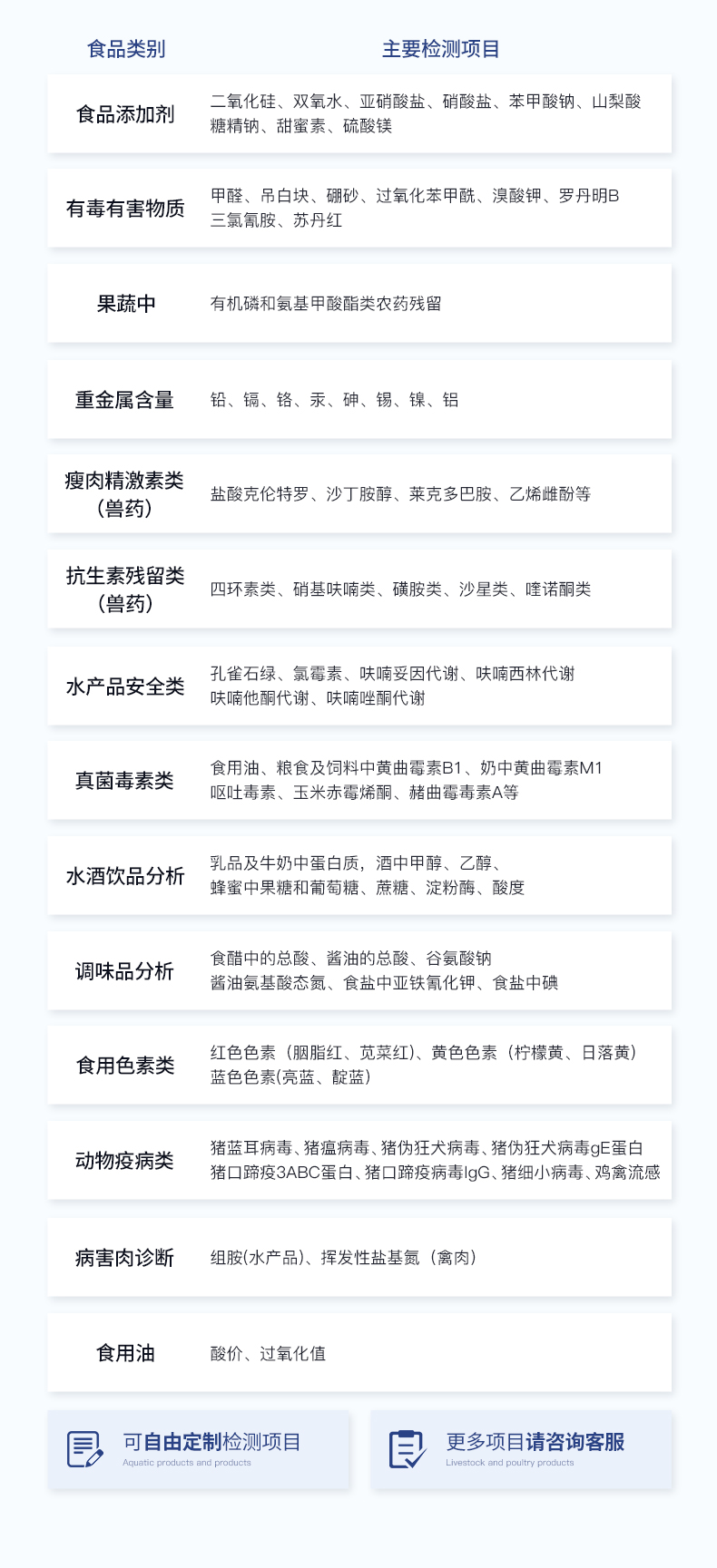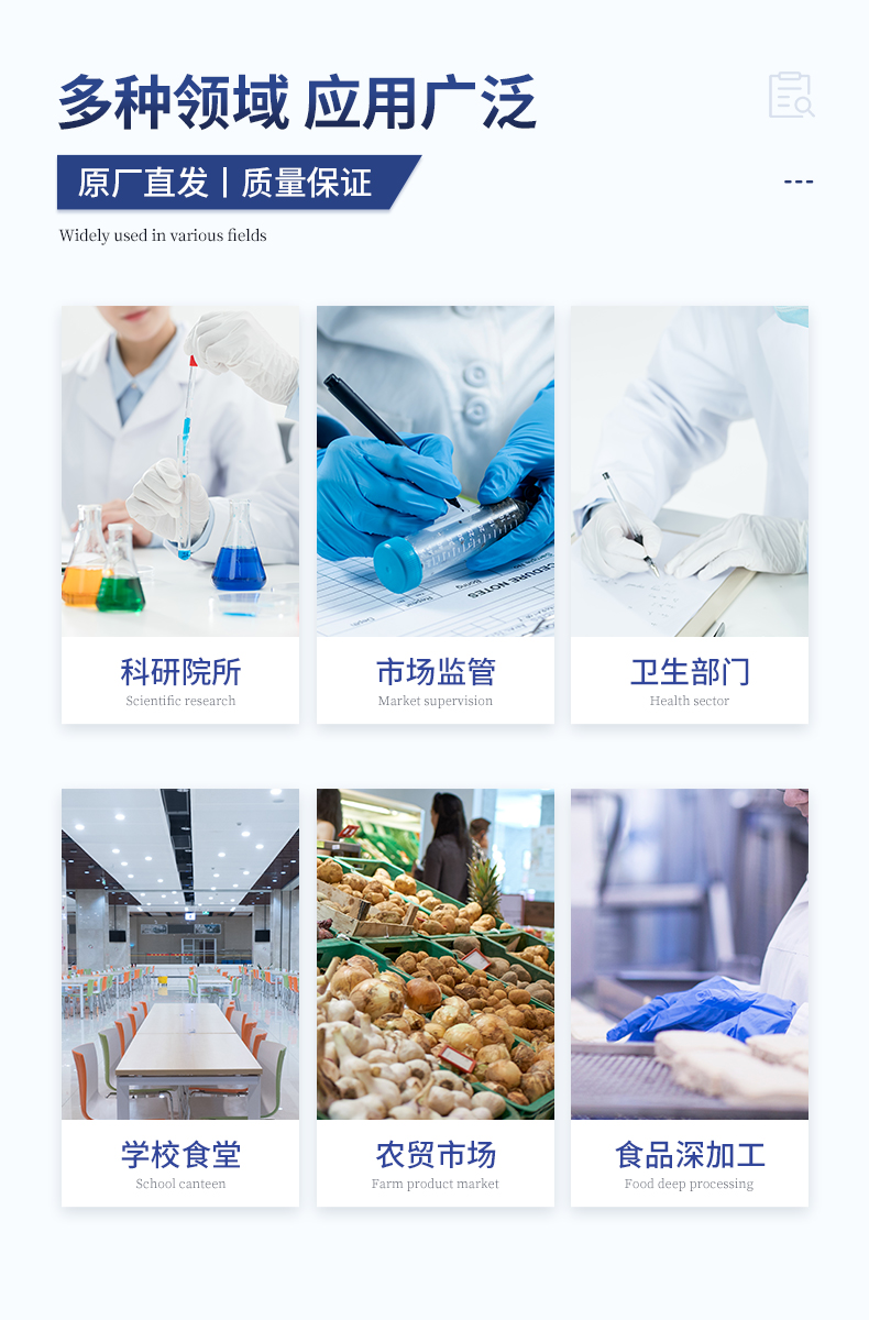 | 食品添加劑:二氧化硫、雙氧水、亞硝酸鹽、硝酸鹽、苯甲酸鈉、山梨酸、糖精鈉、甜蜜素、安賽蜜、硫酸鎂等 | 有毒有害物質:甲醛、吊白塊、硼砂、過氧化苯甲酰、溴酸鉀、羅丹明B、三聚氰胺、蘇丹紅等 | 農藥殘留:酶抑制率法:有機磷氨基甲酸酯類農藥;膠體金法:各種具體農藥檢測 | 病害肉診斷:組胺、揮發性鹽基氮、肉制品酸價、水發產品中組胺 | 重金屬含量:鉛、鎘、鉻、汞、砷、錫、鎳、鋁等;食用油脂檢測:過氧化值、酸價、油脂丙二醛等。 | 食用油脂檢測:::過氧化值、酸價、油脂丙二醛、總多酚等。 | 瘦肉精激素類(獸藥):鹽酸克倫特羅、沙丁胺醇、萊克多巴胺、己烯雌酚、喹乙醇等 | 抗生素殘留類(獸藥):四環素類、硝基呋喃類、磺胺類、β-興奮劑類、沙星類、磺胺類、喹諾酮類,甲砜霉素,氟苯尼考,金剛烷胺、替米考星、慶大霉素、林可霉素、鏈霉素、恩諾沙星、環丙沙星、頭孢啦啶、青霉素、阿莫西林等 | 真菌毒素類:食用油、糧食及飼料中黃曲霉毒素B1、奶中黃曲霉毒素M1、嘔吐毒素、玉米赤霉烯酮、赭曲霉毒素A等 | 水酒飲品分析:乳品及牛奶中蛋白質;酒中甲醇、乙醇、雜醇油;蜂蜜中果糖和葡萄糖、蔗糖、淀粉酶、酸度;水中氰化物、余氯,飲料中維C等 | 調味品成分:食醋的總酸、醬油的總酸、芝麻油純度、谷氨酸鈉、醬油氨基酸態氮、食鹽中亞鐵氰化鉀、食鹽中碘等 | 食用色素類:紅色色素(胭脂紅、莧菜紅、赤蘚紅、誘惑紅)、黃色色素(檸檬黃、日落黃)、藍色色素(亮藍)等 | 動物疫病類:豬藍耳病毒、豬瘟病毒、豬偽狂犬病毒、豬偽狂犬病毒gE蛋白、豬口蹄疫3ABC蛋白、豬口蹄疫病毒IgG、豬細小病毒、雞禽流感等 | 水產品安全類:孔雀石綠、氯霉素、呋喃妥因代謝、呋喃西林代謝、呋喃它酮代謝、呋喃唑酮代謝、氟苯尼考、土霉素、金霉素、甲砜霉素、地西泮等 |