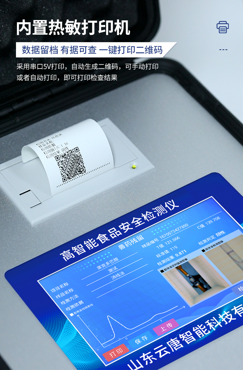 簡介:高精度食品安全檢測儀使用新一代高速熱敏打印機,檢測完成可自動打印或批量打印檢測報告和二維碼。