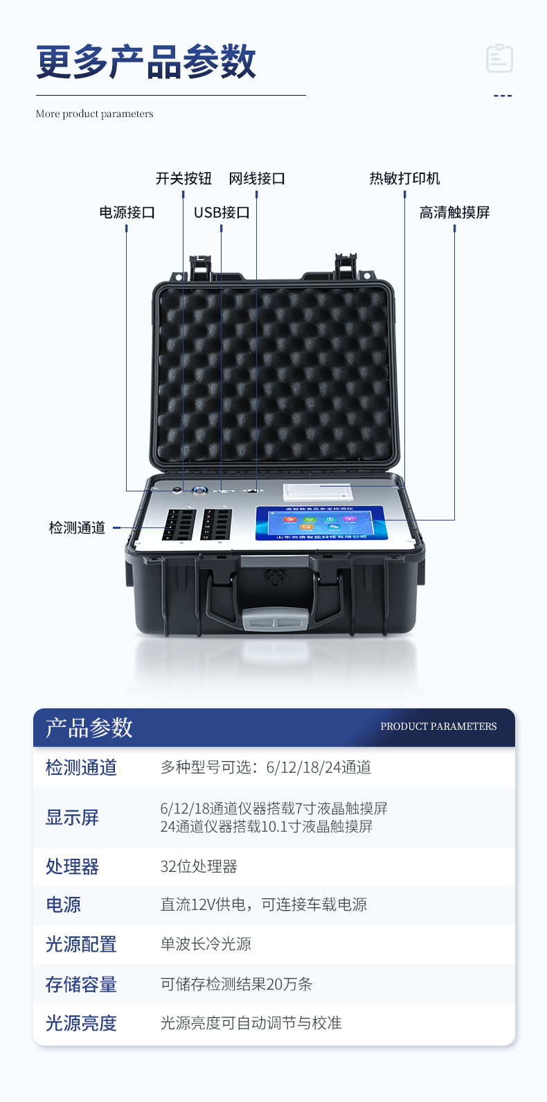 | 1、主控芯片采用ARM Cortex-A7,RK3288/4核處理器,主頻1.88Ghz,運轉速度更快速,穩定性更強。 | 2、★顯示方式:10英寸液晶觸摸屏顯示,人性化中文操作界面,讀數直觀、簡單。 | 3、交直流兩用,直流12V供電,可連接車載電源,可配6ah大容量充電鋰電池,方便戶外流動測試。 | ★4、★四波長冷光源,24個檢測通道,每個通道均配置410、520、590、630nm波長光源,標配**的光路切換裝置,專業光路切換功能可實現*多64波長,并且所有檢測項目可實現所有通道同時檢測。 | 5、智能恒流穩壓,光強自動調節與校準,長時間連續工作光源無溫漂現象。 | ★6、內置新國家限量標準,與所測結果進行現場比對,并持續更新標準。 | 7、不間斷進樣,連續檢測 | 8、樣本編號自動累加。 | 9、檢測結果為Excel表格,連接電腦即可拷貝。 | 10、檢測結果存儲容量20萬條。 | ★11、同時支持U盤拷貝,標準USB接口,免驅動插拔。 | 12、檢測項目可擴充,固件可升級 | 13、儀器尺寸:43×35×19cm, 主機凈重:5.1kg | 14、儀器包裝尺寸:510*390*375mm 包裝重量:9.1kg |