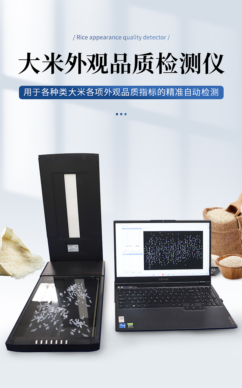 用于代替人工目測來客觀、快速、準確地自動檢測大米的加工精度。待測大米樣品經專用染色劑(伊紅Y-亞甲基藍)染色后,大米上的留皮和胚為藍綠色,胚乳為紫紅色,儀器專用的智能識別軟件由大米每粒整精米上的留皮度及其總占比來自動分析出大米樣品的加工精度。該儀器主要適用于科研院所、檢測單位、碾米廠和流通企業等。