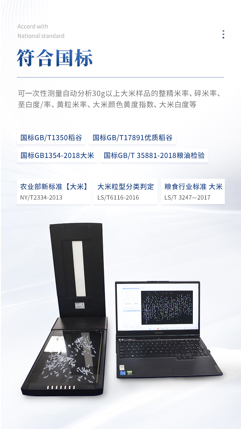 2、★檢測方法完全符合GB/T 5502-2018《糧油檢驗 大米加工精度檢驗》、GB 1354-2018《大米》、GB/T5503-2009《碎米》等相關國家標準。