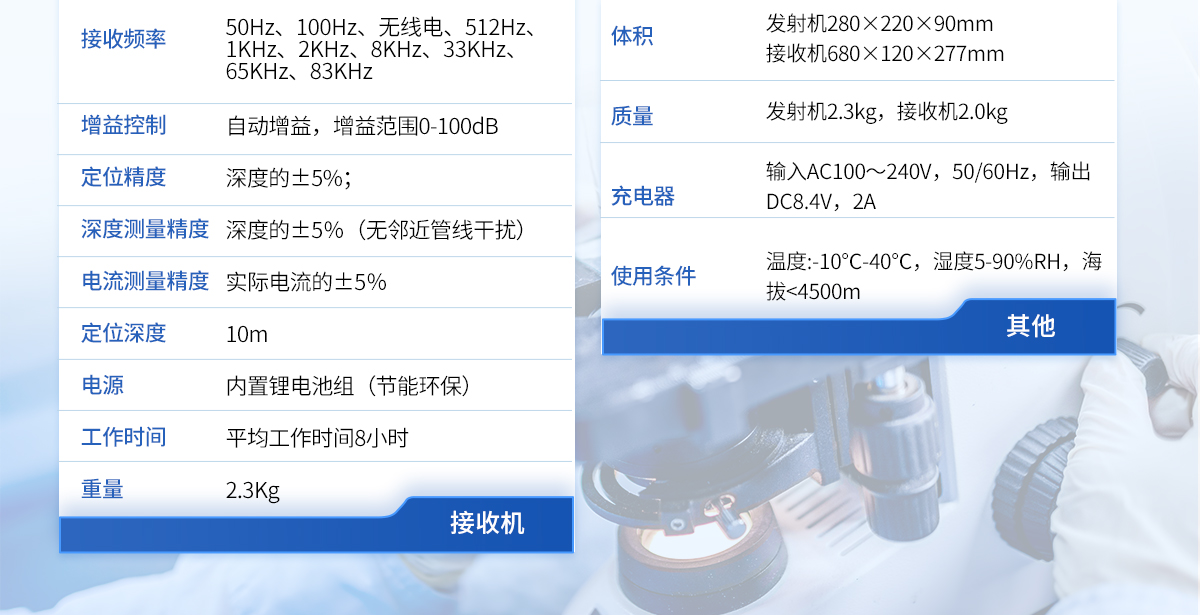 | 1、采用DSP處理器,運算速度快,精度更高; | 2、帶有導向功能指標管線走向,定位更快; | 3、采用10W寬頻發射機,適應各種環境的探測; | 4、接收機和發射機都采用鋰電池組供電,節能環保,每年可節省3000-5000元的電池費用。 |