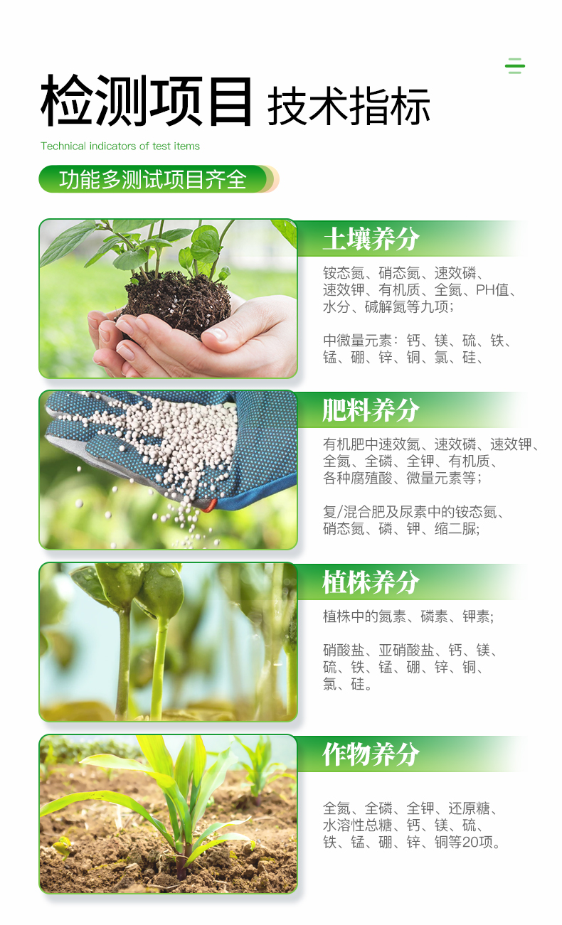 ★可檢測化肥、有機肥(含葉面肥、水溶肥、噴施肥等)中的速效氮、速效磷、有效鉀、全氮、全磷、全鉀、有機質、酸堿度,鈣、鎂、硫、鐵、錳、硼、鋅、銅、氯、硅等各種中微量元素以及鉛、鉻、鎘、汞、砷等各種重金屬含量。