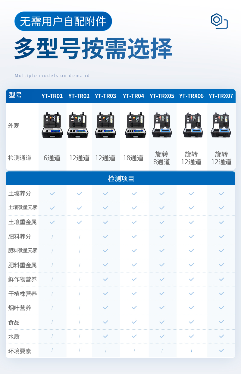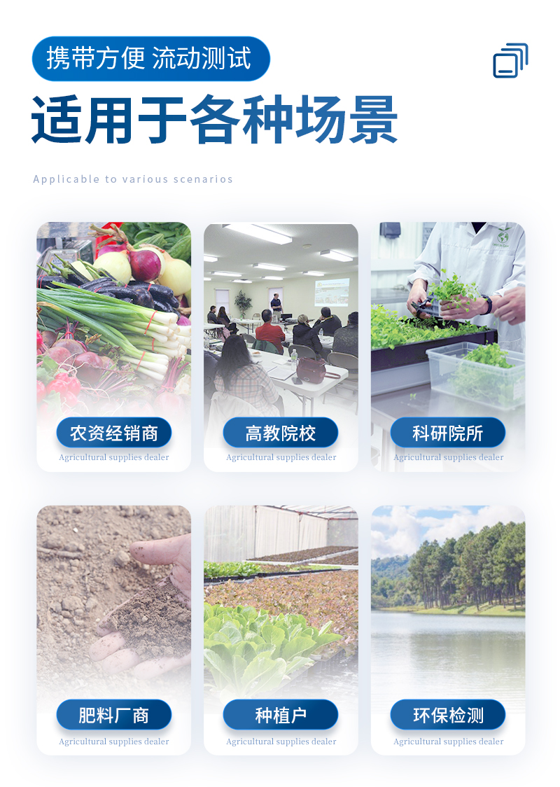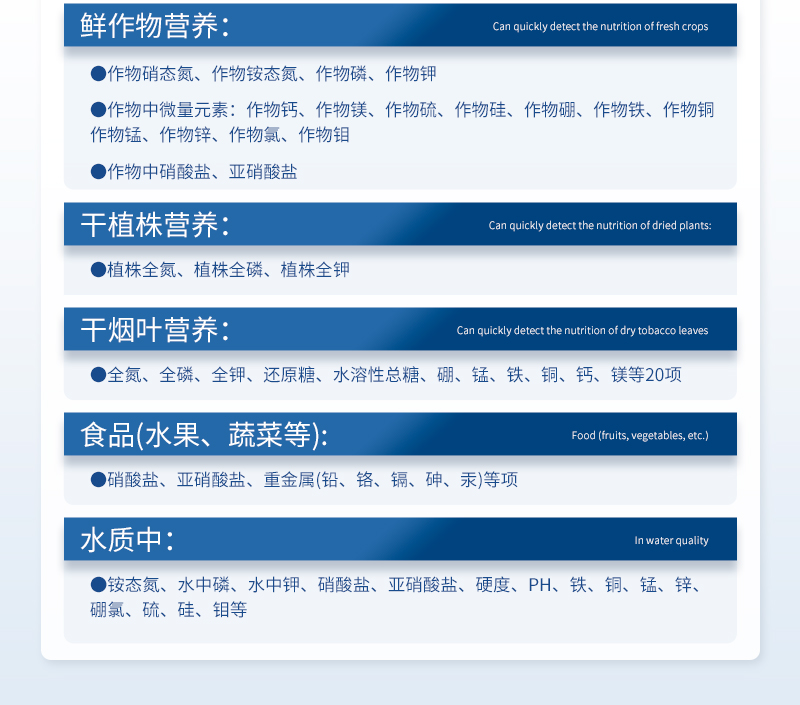 1、土壤養(yǎng)分: ●土壤銨態(tài)氮、土壤有效磷、土壤速效鉀、土壤硝態(tài)氮、土壤水解氮、土壤全氮、土壤全磷、土壤全鉀、土壤有機(jī)質(zhì)(丘林法)、土壤有機(jī)質(zhì)(浸提法)、土壤總有機(jī)碳、土壤碳氮比、PH值、含鹽量、水分。 ●土壤中微量元素:土壤鈣、土壤鎂、土壤硫、土壤硅、土壤硼、土壤鐵、土壤銅、土壤錳、土壤鋅、土壤氯、土壤鉬; ●土壤重金屬:土壤鉛、土壤砷、土壤鎘、土壤鉻、土壤汞、土壤鎳、土壤鋁、土壤氟、土壤鈦、土壤硒。 | 2、肥料養(yǎng)分: ●單質(zhì)肥:氮肥中銨態(tài)氮、肥料硝態(tài)氮、尿素氮、縮二脲、磷肥中磷、磷肥中水溶性磷、鉀肥中鉀; ●復(fù)合肥全氮、復(fù)合肥全磷、復(fù)合肥全鉀; ●有機(jī)肥全氮、有機(jī)肥全磷、有機(jī)肥全鉀、有機(jī)肥硝態(tài)氮、有機(jī)肥速效磷、有機(jī)肥速效鉀、有機(jī)肥酸解氮、有機(jī)質(zhì); ●水溶性腐植酸(風(fēng)化煤)、水溶性腐植酸(褐煤)、水溶性腐植酸(泥炭)、游離態(tài)腐植酸(風(fēng)化煤)、游離態(tài)腐植酸(褐煤)、游離態(tài)腐植酸(泥炭); ●水溶肥全氮、水溶肥全磷、水溶肥全鉀; ●葉面肥全氮、葉面肥全磷、葉面肥全鉀; ●各種肥料微量元素:肥料鈣、肥料鎂、肥料硫、肥料硅、肥料硼、肥料鐵、肥料銅、肥料錳、肥料鋅、肥料氯、肥料鉬; ●肥料重金屬:肥料鉛、肥料砷、肥料鎘、肥料鉻、肥料汞、肥料鎳、肥料鋁、肥料氟、肥料鈦、肥料硒。 | 3、鮮作物營(yíng)養(yǎng): ●作物硝態(tài)氮、作物銨態(tài)氮、作物磷、作物鉀; ●作物中微量元素:作物鈣、作物鎂、作物硫、作物硅、作物硼、作物鐵、作物銅、作物錳、作物鋅、作物氯、作物鉬; ●作物中硝酸鹽、亞硝酸鹽。 | 4、干植株?duì)I養(yǎng): ●植株全氮、植株全磷、植株全鉀 | 5、煙葉營(yíng)養(yǎng): ●全氮、全磷、全鉀、還原糖、水溶性總糖、硼、錳、鐵、銅、鈣、鎂等20項(xiàng)。 | 6、食品(水果、蔬菜等): ●硝酸鹽、亞硝酸鹽、重金屬(鉛、鉻、鎘、砷、汞)等項(xiàng)。 | 7、水質(zhì)中: ●銨態(tài)氮、水中磷、水中鉀、硝酸鹽、亞硝酸鹽、硬度、PH、鐵、銅、錳、鋅、硼、氯、硫、硅、鉬等 |