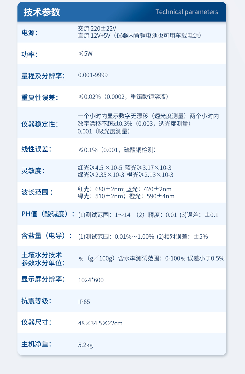 1.電源:交流 220±22V 直流 12V+5V(儀器內(nèi)置鋰電池也可用車(chē)載電源) | 2.功率: ≤5W | 3.量程及分辨率:0.001-9999 | 4.重復(fù)性誤差: ≤0.02%(0.0002,重鉻酸鉀溶液) | 5.儀器穩(wěn)定性:一個(gè)小時(shí)內(nèi)顯示數(shù)字無(wú)漂移(透光度測(cè)量);兩個(gè)小時(shí)內(nèi)數(shù)字漂移不超過(guò)0.3%(0.003,透光度測(cè)量)、0.001(吸光度測(cè)量)。 | 6.線性誤差: ≤0.1%(0.001,硫酸銅檢測(cè)) | 7.靈敏度:紅光≥4.5 ×10-5 藍(lán)光≥3.17×10-3 綠光≥2.35×10-3 橙光≥2.13×10-3 | 8.波長(zhǎng)范圍 :紅光:680±2nm; 藍(lán)光:420±2nm; 綠光:510±2nm;橙光:590±4nm | 9.PH值(酸堿度): (1)測(cè)試范圍:1~14 (2)精度:0.01 (3)誤差:±0.1 | 10.含鹽量(電導(dǎo)):(1)測(cè)試范圍:0.01%~1.00% (2)相對(duì)誤差:±5% | 11.土壤水分技術(shù)參數(shù)水分單位:﹪(g/100g);含水率測(cè)試范圍:0-100﹪;誤差小于0.5% | 12.顯示屏分辨率:1024*600 | 13.抗震等級(jí):IP65 | 14、儀器尺寸:48×34.5×22cm | 15、主機(jī)凈重:5.2kg |