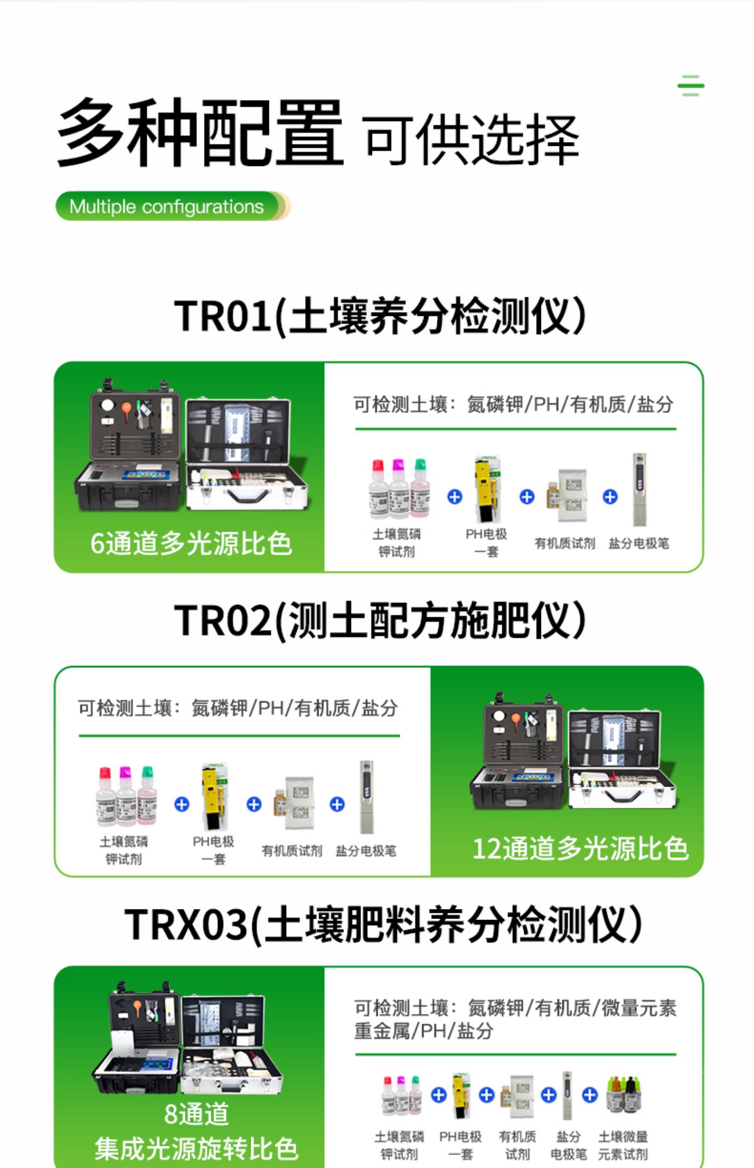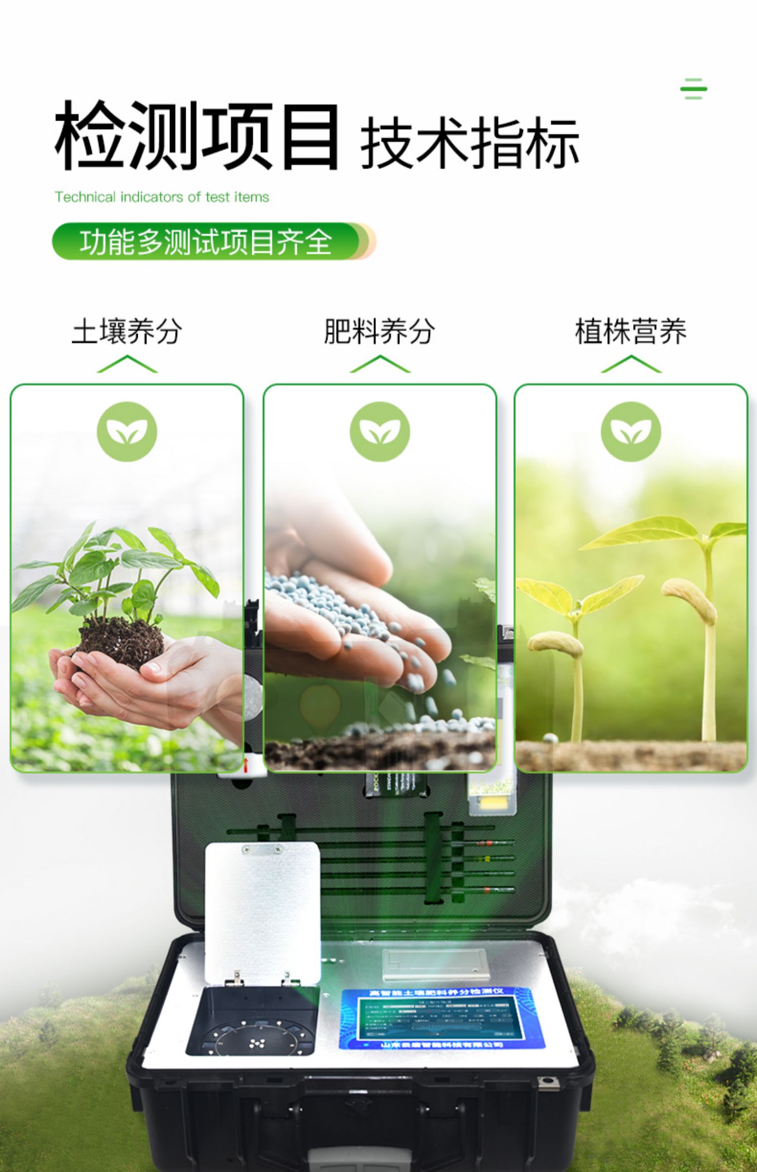 | 1、土壤養分: ●土壤銨態氮、土壤有效磷、土壤速效鉀、土壤硝態氮、土壤堿解氮、土壤全氮、土壤全磷、土壤全鉀、土壤有機質(丘林法)、土壤有機質(浸提法)、土壤總有機碳、土壤碳氮比、PH值、含鹽量、水分。 ●土壤中微量元素:土壤鈣、土壤鎂、土壤硫、土壤硅、土壤硼、土壤鐵、土壤銅、土壤錳、土壤鋅、土壤氯、土壤鉬; ●土壤重金屬:土壤鉛、土壤砷、土壤鎘、土壤鉻、土壤汞、土壤鎳、土壤鋁、土壤氟、土壤鈦、土壤硒。 | 2、環境: 土壤濕度、土壤溫度、土壤電導率、空氣溫度、空氣濕度、露點、大氣壓力、光照度、二氧化碳; | 3、肥料養分: ●單質肥:氮肥中銨態氮、肥料硝態氮、尿素氮、縮二脲、磷肥中磷、磷肥中水溶性磷、鉀肥中鉀; ●復合肥全氮、復合肥全磷、復合肥全鉀; ●有機肥全氮、有機肥全磷、有機肥全鉀、有機肥硝態氮、有機肥速效磷、有機肥速效鉀、有機肥酸解氮、有機質; ●水溶性腐植酸(風化煤)、水溶性腐植酸(褐煤)、水溶性腐植酸(泥炭)、游離態腐植酸(風化煤)、游離態腐植酸(褐煤)、游離態腐植酸(泥炭); ●水溶肥全氮、水溶肥全磷、水溶肥全鉀; ●葉面肥全氮、葉面肥全磷、葉面肥全鉀; ●各種肥料微量元素:肥料鈣、肥料鎂、肥料硫、肥料硅、肥料硼、肥料鐵、肥料銅、肥料錳、肥料鋅、肥料氯、肥料鉬; ●肥料重金屬:肥料鉛、肥料砷、肥料鎘、肥料鉻、肥料汞、肥料鎳、肥料鋁、肥料氟、肥料鈦、肥料硒。 | 4、鮮作物營養: ●作物硝態氮、作物銨態氮、作物磷、作物鉀; ●作物中微量元素:作物鈣、作物鎂、作物硫、作物硅、作物硼、作物鐵、作物銅、作物錳、作物鋅、作物氯、作物鉬; ●作物中硝酸鹽、亞硝酸鹽、總糖量、還原糖、蛋白質。 | 5、干植株營養: ●植株全氮、植株全磷、全鉀、植株中微量元素:植株全鈣、植株全鎂、植株全硫、植株全鐵、植株全錳、植株全硼、植株全鋅、植株全銅、植株全氯、植株全硅。 | 6、煙葉營養: ●全氮、全磷、全鉀、還原糖、水溶性總糖、硼、錳、鐵、銅、鈣、鎂等20項。 | 7、食品(水果、蔬菜等): ●農藥殘留、硝酸鹽、亞硝酸鹽、鉛、砷、鎘、鉻、汞、銅、鋁、二氧化硫、雙氧水、苯甲酸鈉、山梨酸、糖精鈉、甜蜜素、硫酸鎂、甲醛、吊白塊、硼砂、溴酸鉀、總酸、色素、蛋白質、葡萄糖、淀粉酶等項。 | 8、水質中: COD、氨氮、總磷、總氮、余氯、溶解氧、二氧化氯、水中氰化物;重金屬鉛、砷、鎘、鉻、汞;水中硝酸鹽、亞硝酸鹽、硬度、PH、鐵、銅、錳、鋅、鋁、硼、氯、硫、硅等 |