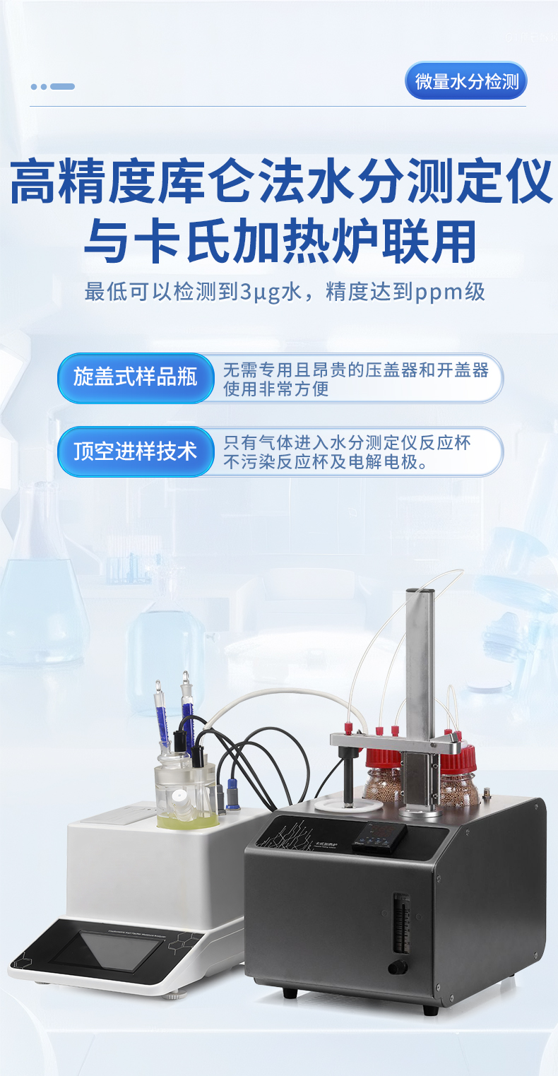 | 1. 采用高精度庫侖法水分測定儀與卡氏加熱爐聯用,**可以檢測到3μg水,精度達到ppm級; | 2. 空芯氣針進樣,和帶加熱功能的氣體輸送管路,零死體積水汽不凝結,操作更簡單,同時也很大的提高了儀器的準確性和重復性; | 3. 5.7寸高清電容觸摸屏,實時顯示測量參數,簡潔明了的功能菜單,全面的參數顯示,操作方便快捷 ; | 4. 內置5種方法可供選擇,8種計算公式方便各種樣品檢測,自定義樣品單位%、ppm、mg/kg等結果單位更加人性化; | 5. 系統實時檢測環境中的水分,精準扣除漂移,采用實時動態阻抗法判定滴定終點,測量結果更精準; | 6. **溫度300℃可以滿足大部分樣品檢測,氣流0-100ml可調,適合各種水分釋放速度的樣品; | 7. 操作方便,用戶只需要設置合適的溫度,合適的流量,把樣品放入事先準備好的樣品瓶,放入加熱器,然后把傳輸針扎入樣品瓶的硅膠墊,在儀器上點開始測量即可; | 8. 無需等待上一次樣品瓶冷卻之后才能進行下一次樣品測量,更換樣品瓶過程中樣品瓶始終保持密封狀態,測量效率更高更準確,尤其是吸濕性強的樣品無需擔心空氣中水分的干擾; | 9. 采用頂空進樣的方式,保證每個測定采用“新”的樣品瓶,樣品測定無交叉感染。樣品瓶體積小,確保較小的死體積和背景水分值。獨立密閉樣品瓶,測定時無需樣品轉移,結果更準確; | 10. 旋蓋式樣品瓶,無需專用且昂貴的壓蓋器和開蓋器,使用非常方便; | 11. 頂空進樣技術,只有氣體進入水分測定儀反應杯,不污染反應杯及電解電極。 |