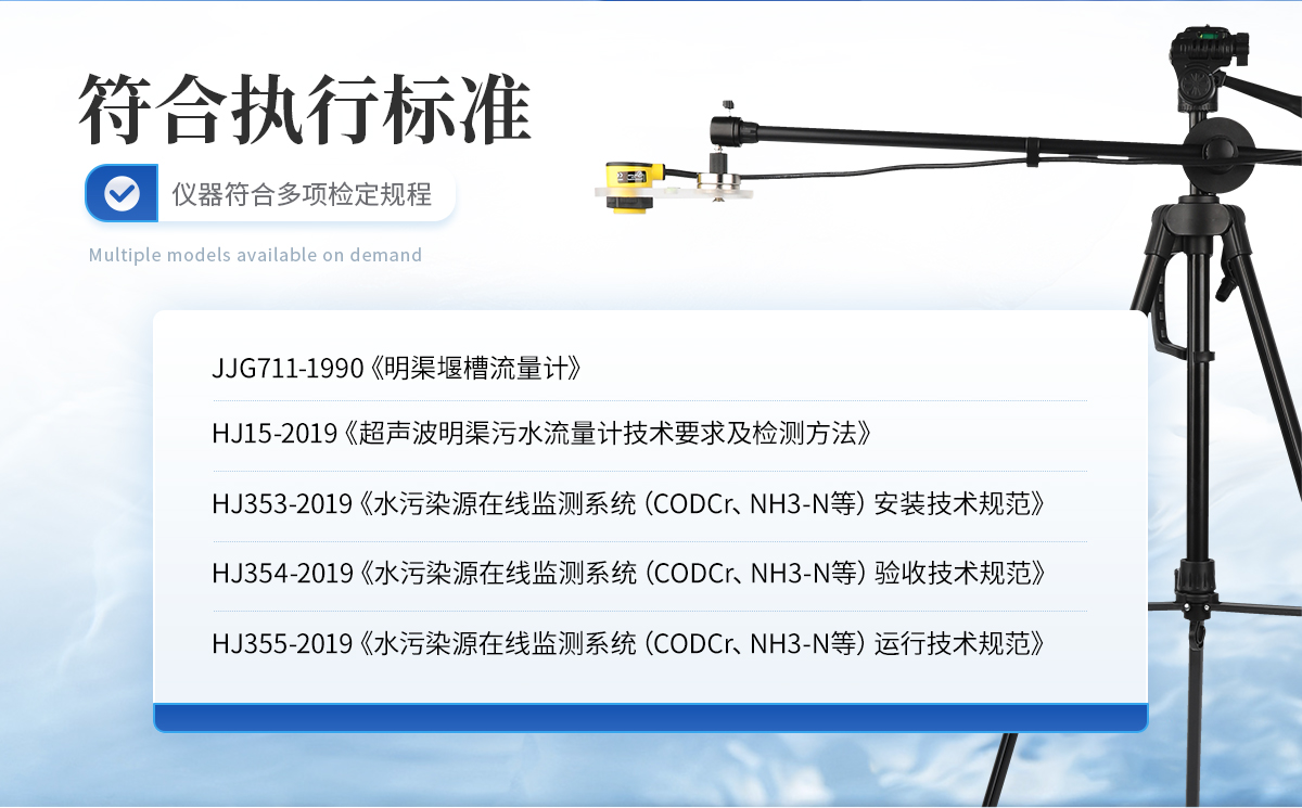 JJG 711-1990 《明渠堰槽流量計》 ZJJ-LR-01-2022《超聲波明渠流量計試行檢定規(guī)程》 HJ 15-2019 《超聲波明渠污水流量計技術(shù)要求及檢測方法》 HJ 353-2019 《水污染源在線監(jiān)測系統(tǒng)(CODCr、NH3-N等)安裝技術(shù)規(guī)范》 HJ 354-2019 《水污染源在線監(jiān)測系統(tǒng)(CODCr、NH3-N 等)驗收技術(shù)規(guī)范》 HJ 355-2019 《水污染源在線監(jiān)測系統(tǒng)(CODCr、NH3-N等)運行技術(shù)規(guī)范》