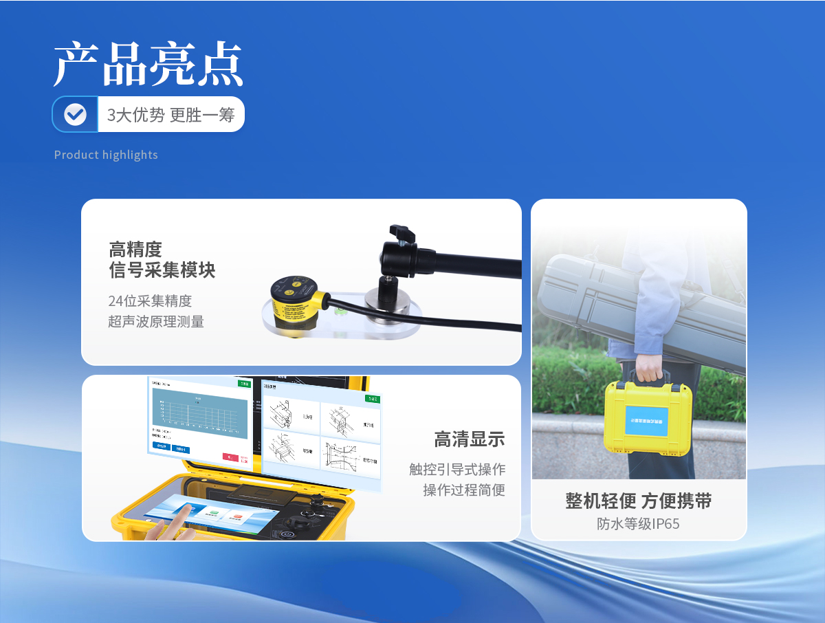 適應(yīng)于四種基本堰型:三角堰、 矩形堰、 等寬堰、 巴歇爾槽 高精度信號采集模塊,24 位采集精度,測量數(shù)據(jù)真實有效 大屏幕彩色液晶觸摸屏,觸控引導(dǎo)式操作,操作過程簡便 曲線顯示流量變化趨勢及液位變化趨勢 友好的人機交互界面,圖文結(jié)合,即可對儀器進(jìn)行操作 儀器帶有微型打印機,可現(xiàn)場直接打印測量數(shù)據(jù) 可與電腦連接,將測量數(shù)據(jù)輸出至電腦,便于用戶對數(shù)據(jù)進(jìn)行統(tǒng)計分析 可存儲 50000 次的測量歷史記錄 內(nèi)含大容量鋰電池,一次充電可連續(xù)測量 72 小時 流量計內(nèi)置智能化電源管理系統(tǒng),延長電池使用壽命 開機密碼進(jìn)入,有效保護(hù)測量比對數(shù)據(jù)及結(jié)果 手提箱式設(shè)計,整機重量輕,方便用戶攜帶 具有USB數(shù)據(jù)導(dǎo)出和打印機數(shù)據(jù)打印功能 可選配GRS或北頭定位功能