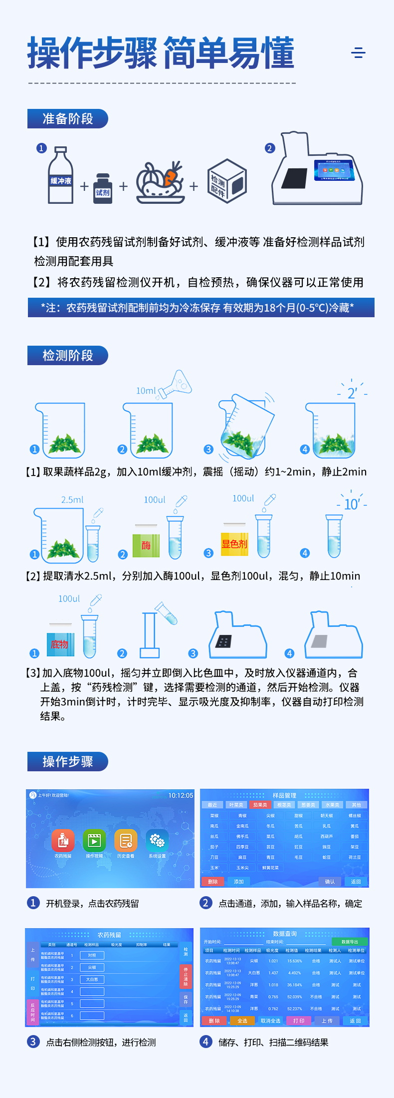 檢測標(biāo)準(zhǔn):依據(jù)國家標(biāo)準(zhǔn)方法(GB/T5009.199-2003)以及世界衛(wèi)生組織WHO、世界糧農(nóng)組織FAO殘留農(nóng)藥檢測標(biāo)準(zhǔn)、世界環(huán)境保護(hù)局EPA參照攝入量等要求來設(shè)計。采用酶抑制率比色法對水果、蔬菜等農(nóng)林產(chǎn)品中有機(jī)磷和氨基甲酸酯類農(nóng)藥含量進(jìn)行快速準(zhǔn)確的檢測,乙酰膽堿酯酶和丁酰膽堿酯酶試劑均可以使用,符合國家標(biāo)準(zhǔn)和農(nóng)業(yè)部標(biāo)準(zhǔn)的要求。