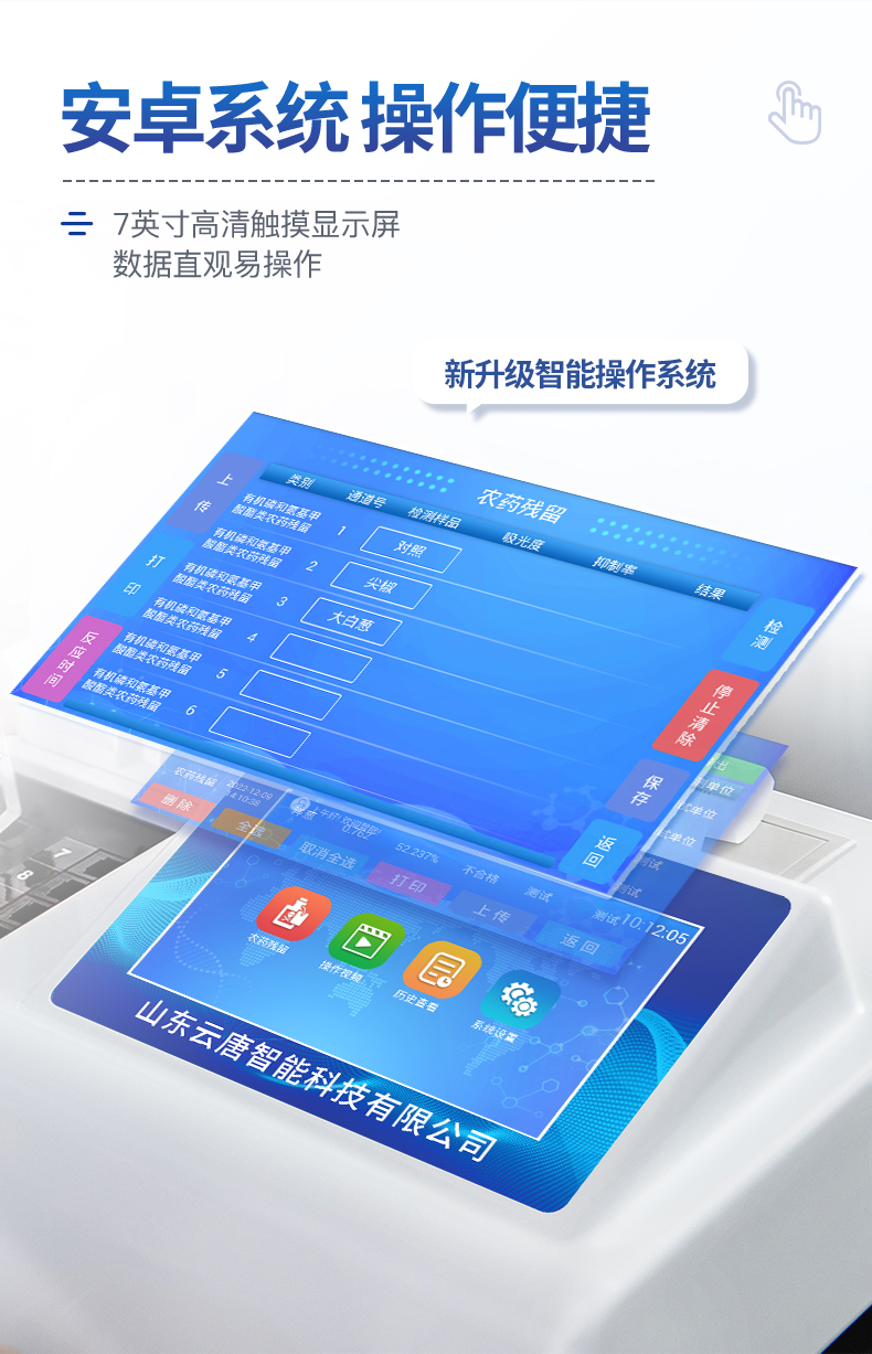 乙酰膽堿酯酶和丁酰膽堿酯酶試劑均可以使用,符合國家標準和農業部標準的要求。 自動判斷樣品是否合格,檢測結果更加直觀。儀器具有100多種蔬菜名稱菜單庫,分類管理,并可按需添加或刪除蔬菜名,編輯蔬菜名稱,可直接打印出蔬菜名稱。 檢測通道:12個檢測通道,可以同時測試多個樣品,循環檢測,即放即檢,每個樣品由程序控制分別獨立工作,不會互相干擾。智能操作系統,采用更加人性化操作,主控采用多核處理器,主頻1.88Ghz,運轉速度更快速,穩定性更強。 顯示方式:7英寸高靈敏真彩觸摸屏顯示,人性化中文操作界面,讀數直觀、簡單。打印機采用串口5v打印,可選擇手動打印或者自動打印,三分鐘出打印結果,打印格式為檢測人姓名、吸光度差值、檢測時間、檢測機構、樣品名稱及結果判定。 光源采用進口超高亮發光二極管,具有低功耗、高精度、穩定性強、光源可控可以關掉不使用的光源,響應速度快等優點。智能恒流穩壓,光強自動校準,長時間連續工作光源無溫漂現象。 儀器具有GPRS遠傳功能,可插手機卡實現數據遠傳平臺,wifi聯網功能,可將數據快速上傳電腦,進行數據管理與統計。采用USB2.0接口設計,方便數據的存貯和移動,并可隨時與計算機直接相連,并且可用計算機控制儀器。實現數據查詢、瀏覽、分析、統計、打印等。 智能化程度高,儀器具有自檢功能:具有開機自檢和調零功能,具有自動檢測重復性功能儀器具有自身保護功能,可設置用戶名及密碼,防止非工作人員操作等。 采用DC12v直流供電,安全系統更高,并且配備6A鋰電池充電器。儀器具有重新校準、鎖定、恢復出廠設置功能。
