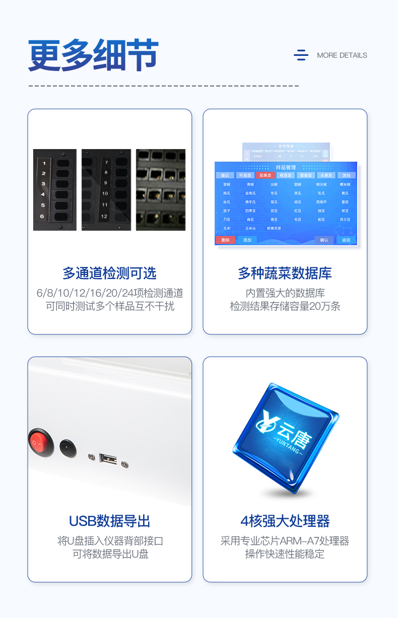 乙酰膽堿酯酶和丁酰膽堿酯酶試劑均可以使用,符合國家標準和農業部標準的要求。 自動判斷樣品是否合格,檢測結果更加直觀。儀器具有100多種蔬菜名稱菜單庫,分類管理,并可按需添加或刪除蔬菜名,編輯蔬菜名稱,可直接打印出蔬菜名稱。 檢測通道:12個檢測通道,可以同時測試多個樣品,循環檢測,即放即檢,每個樣品由程序控制分別獨立工作,不會互相干擾。智能操作系統,采用更加人性化操作,主控采用多核處理器,主頻1.88Ghz,運轉速度更快速,穩定性更強。 顯示方式:7英寸高靈敏真彩觸摸屏顯示,人性化中文操作界面,讀數直觀、簡單。打印機采用串口5v打印,可選擇手動打印或者自動打印,三分鐘出打印結果,打印格式為檢測人姓名、吸光度差值、檢測時間、檢測機構、樣品名稱及結果判定。 光源采用進口超高亮發光二極管,具有低功耗、高精度、穩定性強、光源可控可以關掉不使用的光源,響應速度快等優點。智能恒流穩壓,光強自動校準,長時間連續工作光源無溫漂現象。 儀器具有GPRS遠傳功能,可插手機卡實現數據遠傳平臺,wifi聯網功能,可將數據快速上傳電腦,進行數據管理與統計。采用USB2.0接口設計,方便數據的存貯和移動,并可隨時與計算機直接相連,并且可用計算機控制儀器。實現數據查詢、瀏覽、分析、統計、打印等。 智能化程度高,儀器具有自檢功能:具有開機自檢和調零功能,具有自動檢測重復性功能儀器具有自身保護功能,可設置用戶名及密碼,防止非工作人員操作等。 采用DC12v直流供電,安全系統更高,并且配備6A鋰電池充電器。儀器具有重新校準、鎖定、恢復出廠設置功能。