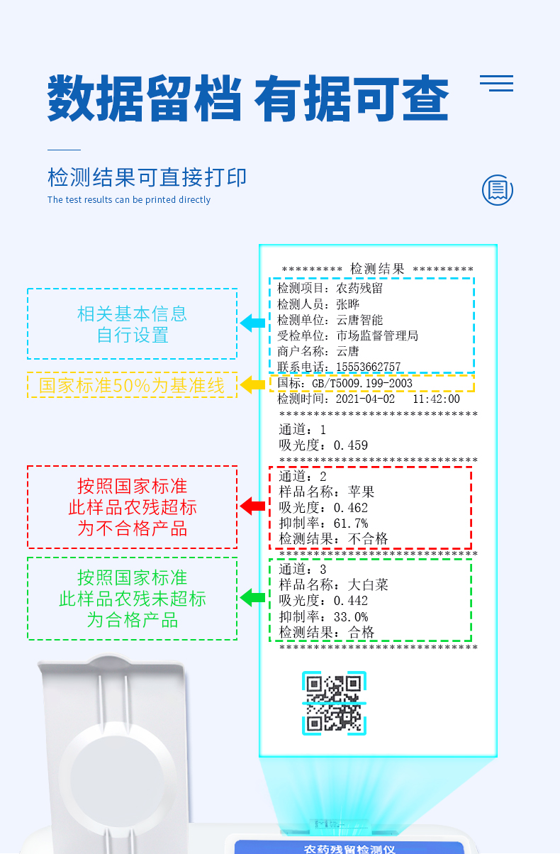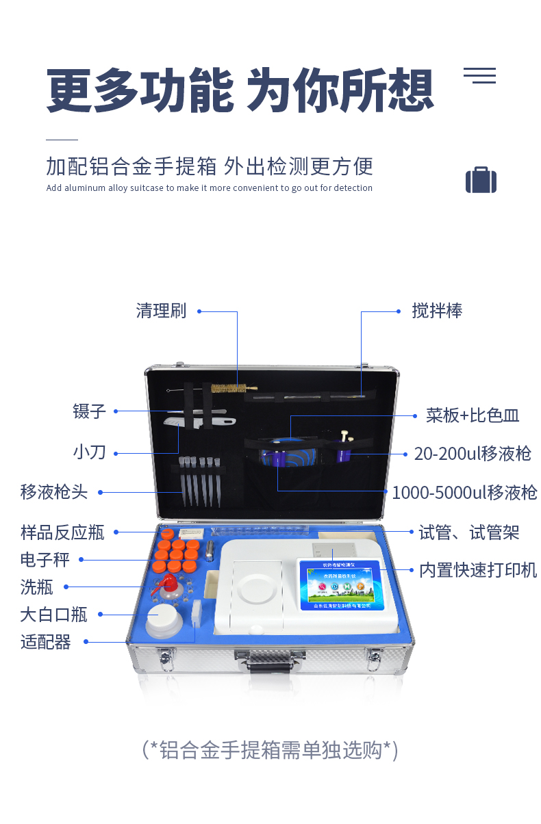 | 乙酰膽堿酯酶和丁酰膽堿酯酶試劑均可以使用,符合國家標(biāo)準(zhǔn)和農(nóng)業(yè)部標(biāo)準(zhǔn)的要求。 | 自動判斷樣品是否合格,檢測結(jié)果更加直觀。 | 儀器具有100多種蔬菜名稱菜單庫,分類管理,并可按需添加或刪除蔬菜名,編輯蔬菜名稱,可直接打印出蔬菜名稱。 | 檢測通道:12個檢測通道,可以同時(shí)測試多個樣品,循環(huán)檢測,即放即檢,每個樣品由程序控制分別獨(dú)立工作,不會互相干擾。 | 智能操作系統(tǒng),采用更加人性化操作,主控采用多核處理器,主頻1.88Ghz,運(yùn)轉(zhuǎn)速度更快速,穩(wěn)定性更強(qiáng)。 | 顯示方式:7英寸高靈敏真彩觸摸屏顯示,人性化中文操作界面,讀數(shù)直觀、簡單。 | 打印機(jī)采用串口5v打印,可選擇手動打印或者自動打印,三分鐘出打印結(jié)果,打印格式為檢測人姓名、吸光度差值、檢測時(shí)間、檢測機(jī)構(gòu)、樣品名稱及結(jié)果判定。 | 光源采用進(jìn)口超高亮發(fā)光二極管,具有低功耗、高精度、穩(wěn)定性強(qiáng)、光源可控可以關(guān)掉不使用的光源,響應(yīng)速度快等優(yōu)點(diǎn)。 | 智能恒流穩(wěn)壓,光強(qiáng)自動校準(zhǔn),長時(shí)間連續(xù)工作光源無溫漂現(xiàn)象。 | 儀器具有GPRS遠(yuǎn)傳功能,可插手機(jī)卡實(shí)現(xiàn)數(shù)據(jù)遠(yuǎn)傳平臺,wifi聯(lián)網(wǎng)功能,可將數(shù)據(jù)快速上傳電腦,進(jìn)行數(shù)據(jù)管理與統(tǒng)計(jì)。 | 采用USB2.0接口設(shè)計(jì),方便數(shù)據(jù)的存貯和移動,并可隨時(shí)與計(jì)算機(jī)直接相連,并且可用計(jì)算機(jī)控制儀器。實(shí)現(xiàn)數(shù)據(jù)查詢、瀏覽、分析、統(tǒng)計(jì)、打印等。 | 智能化程度高,儀器具有自檢功能:具有開機(jī)自檢和調(diào)零功能,具有自動檢測重復(fù)性功能 | 儀器具有自身保護(hù)功能,可設(shè)置用戶名及密碼,防止非工作人員操作等。 | 采用DC12v直流供電,安全系統(tǒng)更高,并且配備6A鋰電池充電器。 | 儀器具有重新校準(zhǔn)、鎖定、恢復(fù)出廠設(shè)置功能。 |