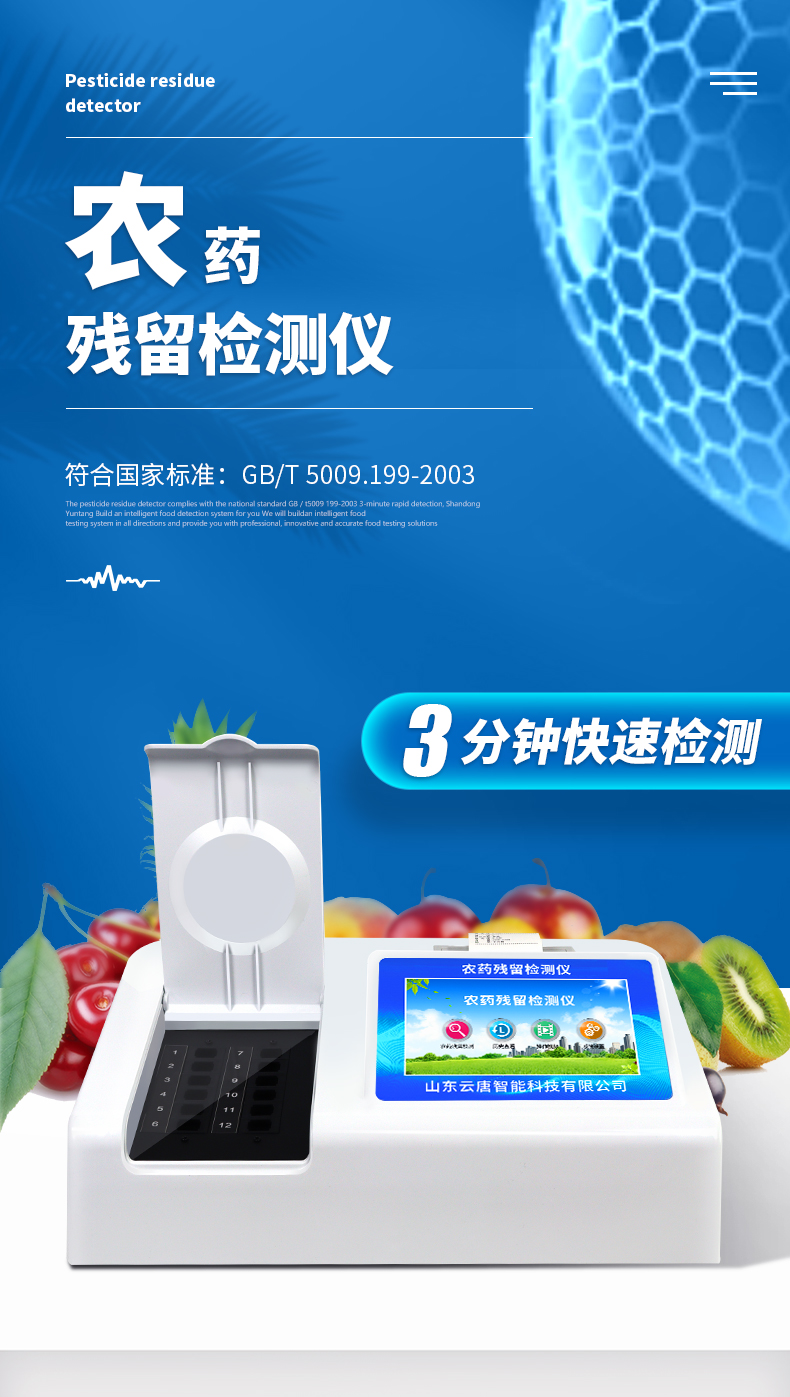 檢測標(biāo)準(zhǔn):依據(jù)國家標(biāo)準(zhǔn)方法(GB/T5009.199-2003)以及世界衛(wèi)生組織WHO、世界糧農(nóng)組織FAO殘留農(nóng)藥檢測標(biāo)準(zhǔn)、世界環(huán)境保護(hù)局EPA參照攝入量等要求來設(shè)計(jì)。采用酶抑制率比色法對水果、蔬菜等農(nóng)林產(chǎn)品中有機(jī)磷和氨基甲酸酯類農(nóng)藥含量進(jìn)行快速準(zhǔn)確的檢測,乙酰膽堿酯酶和丁酰膽堿酯酶試劑均可以使用,符合國家標(biāo)準(zhǔn)和農(nóng)業(yè)部標(biāo)準(zhǔn)的要求。