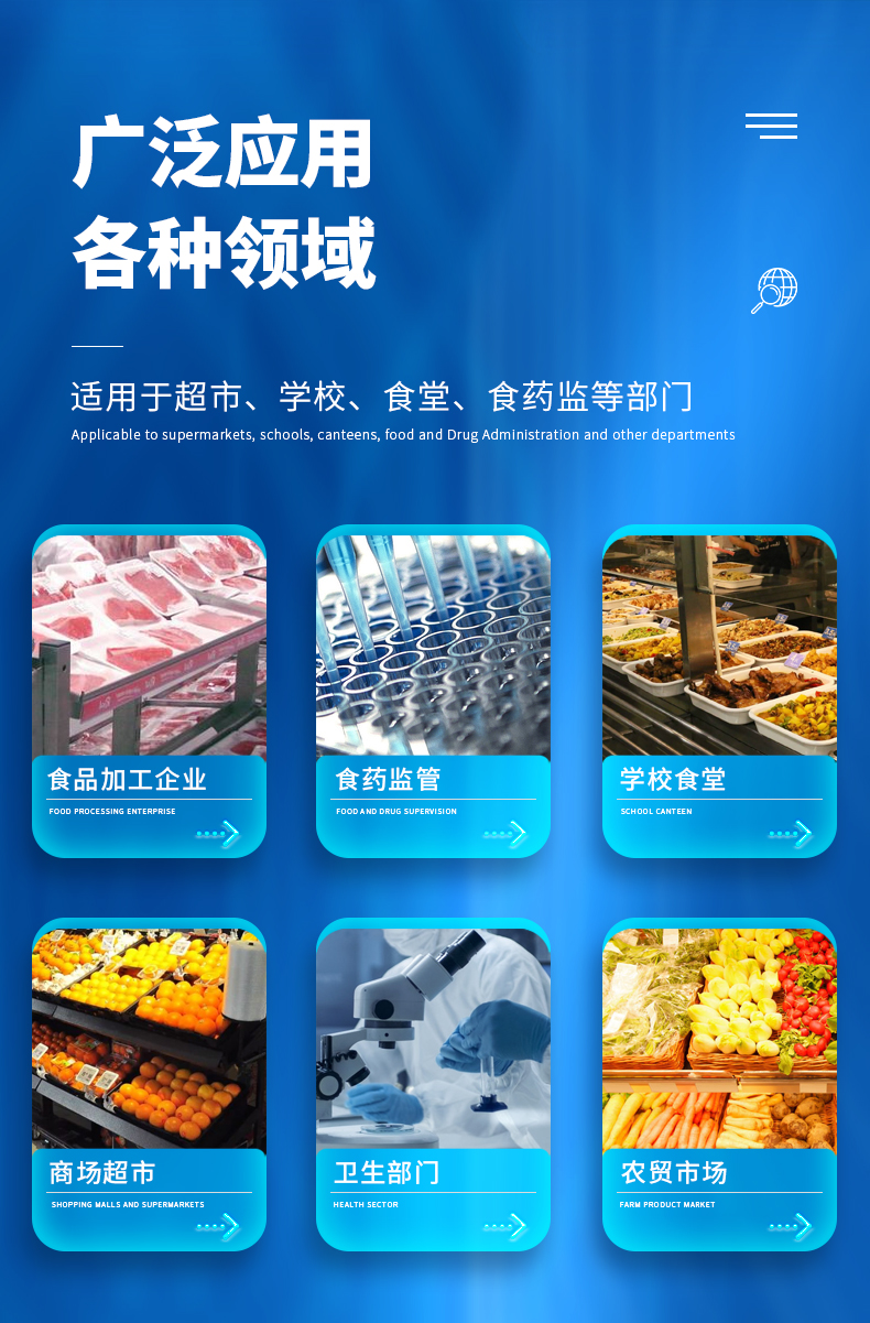 廣泛應(yīng)用于主要用于蔬菜、水果、茶葉、糧食、農(nóng)副產(chǎn)品等食品中有機(jī)磷和氨基甲酸酯類農(nóng)藥殘留的快速檢測;此外還可用于果蔬茶生產(chǎn)基地和農(nóng)貿(mào)批發(fā)銷售市場現(xiàn)場檢測,餐館、學(xué)校、食堂、家庭果蔬加工前的安全速測等。