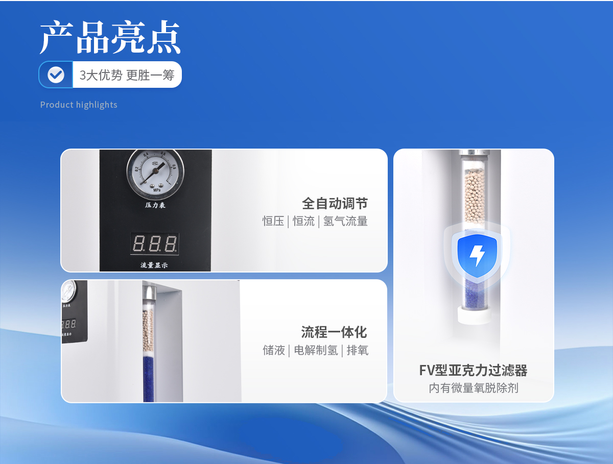 | 1、壓力、流量自動顯示,自動恒壓、恒流、氫氣流量可根據用量實現全自動調節。 | 2、FV型亞克力過濾器,內有微量氧脫除劑(不需要活化),氫氣純度更高;儀器內部采用硅橡膠圈(含硫量低),有效提高氣體質量,保證色譜基線平穩。 | 3、儲液、電解制氫、排氧一體化,池溫低,壽命長久。 | 4、配有安全裝置,靈敏可靠,自動防返堿。 |