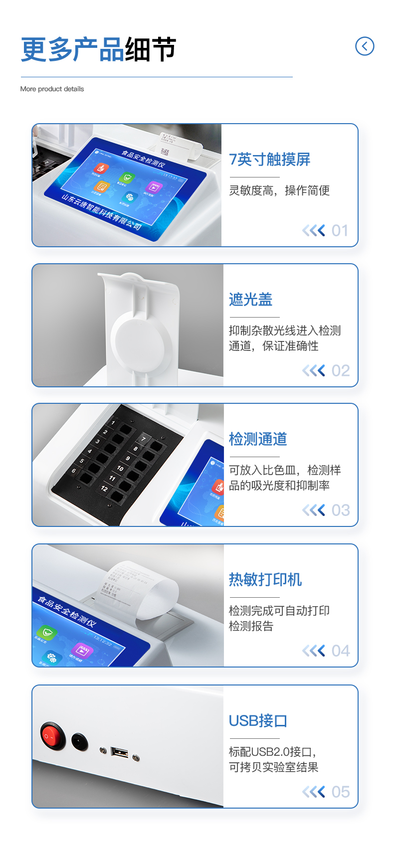 可快速檢測各類食品中的甲醛、吊白塊、二氧化硫、亞硝酸鹽、雙氧水、硼砂、農(nóng)藥殘留、乳及乳制品中蛋白質(zhì)的含量,儀器預(yù)留其他項(xiàng)目檢測程序和端口,根據(jù)日后需求可方便的自主增加檢測項(xiàng)目。