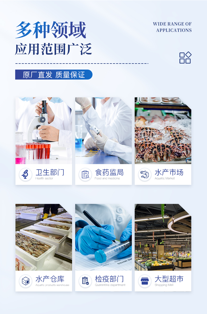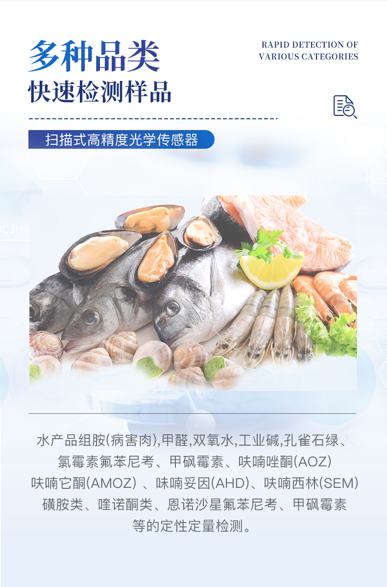 適用于魚、蝦等水產中孔雀石綠、氯霉素、硝基呋喃類:呋喃唑酮(AOZ)、呋喃它酮( AMOZ )、呋喃妥因(AHD)、呋喃西林(SEM)、呋喃那斯、磺胺類、激素類、四環素類、金霉素、土霉素、甲砜霉素、氟苯尼考、喹諾酮類藥物:噁喹酸、諾氟沙星、恩諾沙星、環丙沙星、氧氟沙星的定性定量檢測。