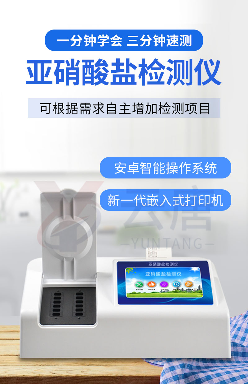 食品中亞硝酸鹽快速檢測儀為集成化食品安全檢測分析設(shè)備,能夠快速檢測肉類、肉類罐頭、熏肉、香腸、奶制品、泡菜、腌制蔬菜等中的亞硝酸鹽含量;該儀器是根據(jù)GB5009.33-2010《食品中亞硝酸鹽與硝酸鹽的測定》,食品中的亞硝酸鹽經(jīng)過提取,與檢測試劑反應(yīng)生成有色化合物,再利用亞硝酸鹽檢測儀測定其吸光度,在一定范圍內(nèi)吸光度與含量成正比。通過檢測可確定食品是否符合國家標(biāo)準(zhǔn)或是否為超標(biāo)毒害食品等。儀器預(yù)留其他項目檢測程序和端口,根據(jù)日后需求可方便的自主增加檢測項目。日后可升級為檢測水產(chǎn)品、面制品的綜合類型儀器。