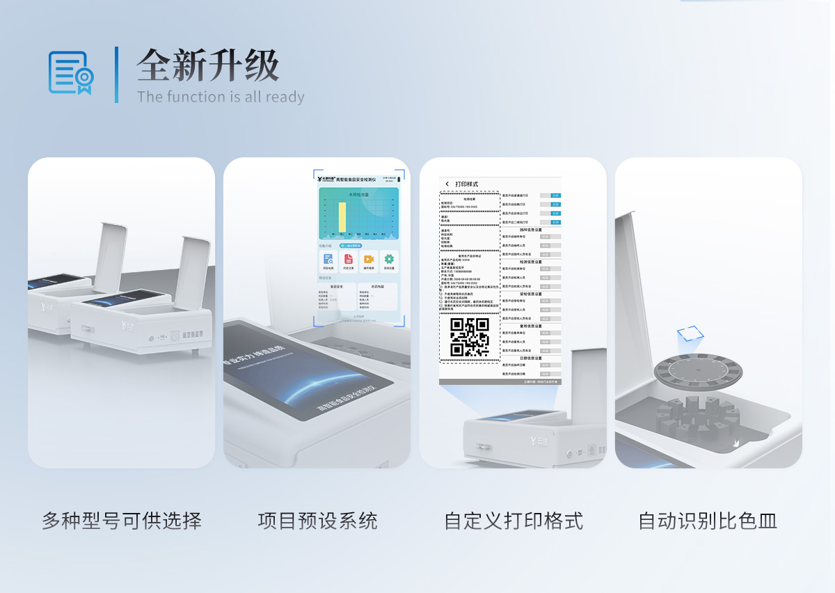 | 儀器采用臺式一體化系統檢測技術,將分光光度模塊、膠體金檢測模塊、新型農殘檢測模塊、數字化管理模塊、無線通訊模塊高度集成于一體,支持檢測200種食品安全檢測項目,同時預留升級檢測方法。 | 儀器檢測模塊標準化、智能化,可隨意自由組合。檢測箱體內置多個標準檢測單元,檢測模塊可以調整配置。 | 儀器采用全新安卓智能系統,主控芯片采用 ARM Cortex-A7,RK3288/4核處理器,10.1寸高清液晶觸摸豎屏,更加**的UI交互界面,運轉快捷;儀器配備無線通信模塊: 4G(APN)通訊模塊、Wifi模塊,藍牙傳輸,同時具有雙USB接口以及RJ45接口能以多種方式實現數據保存和數據傳輸功能。 | 創新檢測模式★檢測通道:≥12通道;采用精密旋轉比色池設計,使用同芯片同光源校準精度,解決不同光源之間的誤差值。1-12通道間誤差0.1%。(**號:**202022821055.2) ★儀器具有自動識別比色皿檢測功能,即:將樣品比色皿放入儀器后,點擊樣品檢測,儀器自動識別比色皿進行通道檢測。 | 進口高精光源:高精度進口四波長冷光源,通道配置 410、520、590、630nm 波長光源,一個光源芯片驅動一個光源,誤差極小,每臺設備單獨**校準光源,**比對,同時參照四種不同波段光源全方位覆蓋市面上99%的農殘食品項目檢測。 | 膠體金模塊檢測方式:★采用COMS實時成像技術,可采集多個畫面,支持2個金標同時讀卡,通過不同顏色的灰度變化,一秒精準得出結果。 | 智能操作分析系統: | ★便捷操作系統:設備檢測時可在同一檢測界面自動對應相關檢測通道一次性選擇1-12個樣品名稱,無須退出界面,節省操作時間。(需提供對應證明) | ★數據集成系統:設備首頁自動統計檢測數據包含:周檢測數據、月檢測數據,全部檢測總數量,均包含檢測總數,合格數,不合格數,以及相關柱形分析圖,對各項檢測數據清晰掌握,無需電腦查詢,更加快捷直觀。(需提供對應證明文件) | ★項目預設系統:支持添加單個及多個相同或不相同的任務預設,一鍵快速調取,每一個任務分別可以設置不同的樣品、批次、編號、來源、備注、抽樣信息、檢測信息、受檢信息、復核信息等更多信息。無縫鏈接平臺和APP實時查看下發任務。(需提供對應證明文件) | ★數據監管系統:同步對接監管平臺,數據可局域網和互聯網數據上傳,檢測結果可選擇直接傳至食品安全監管平臺。集成OSS輸出存儲服務、區分設備定向管理應用,進行區域食品安全監管及大數據分析處理與數據統計,檢測區域食品安全長短期動態,達到食品安全問題預估、預警。(需提供對應食品理化分析系統計算機軟件著作權)。 | ★ 自定義打印系統:內置全新打印系統,新創自定義打印方式,可按需靈活設置開啟或關閉:產品合格證(國家農業部標準要求),二維碼,抽樣信息、檢測信息,受檢信息、復核信息、抽樣日期、檢測日期等信息的打印。(需提供對應證明) | ★系統遠程更新功能:可定向分客戶分儀器更新系統,按照不同客戶后期實際需求添加項目,無需機器返廠,即可遠程實時升級全新系統,節省時間成本及避免運輸造成設備損壞。 | 儀器主機采用一體化防水、抗壓、防撞擊、防腐蝕箱體設計,同時配備交直流供電,可連接車載電源,可選配大容量充電鋰電池,滿足現場野外檢測需求。 | 安全證書,放心保障:儀器具有中國計量科學研究院校準證書,權威認證。 |