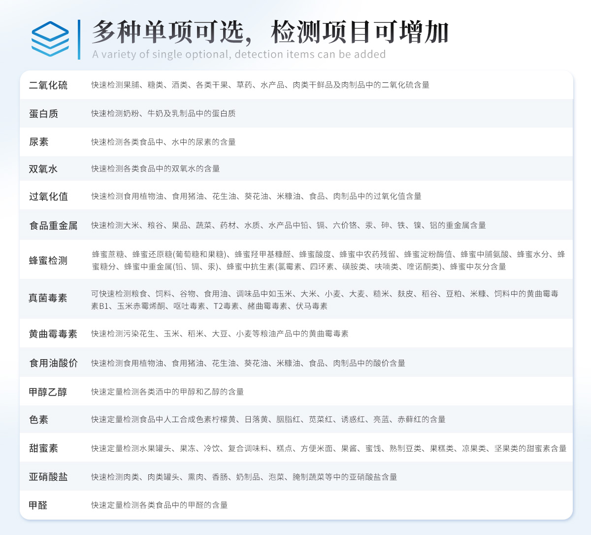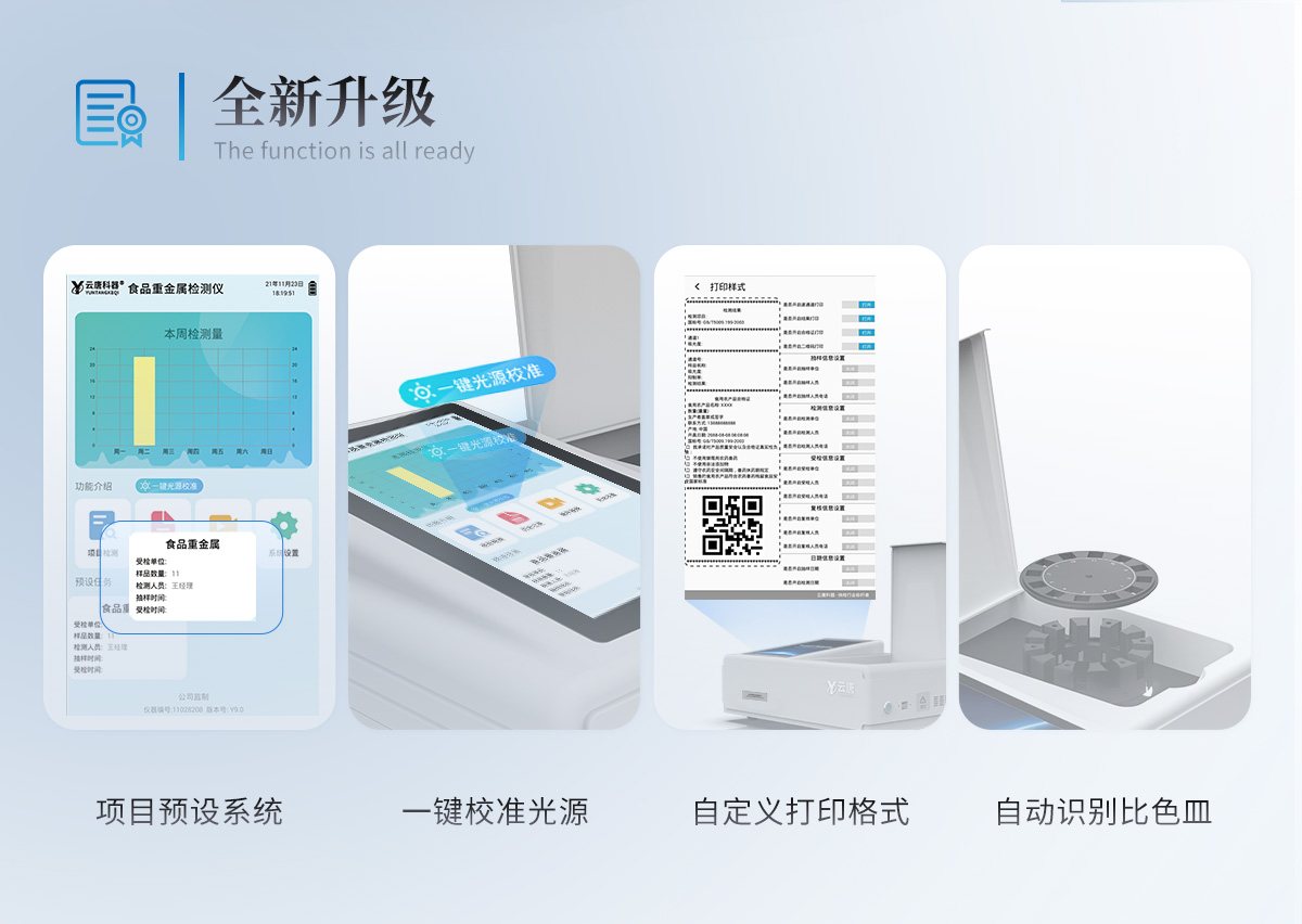 | 儀器采用臺(tái)式一體化系統(tǒng)檢測(cè)技術(shù),將分光光度模塊、新型農(nóng)殘檢測(cè)模塊、數(shù)字化管理模塊、無(wú)線通訊模塊高度集成于一體,支持檢測(cè)200種食品安全檢測(cè)項(xiàng)目,同時(shí)預(yù)留升級(jí)檢測(cè)方法。 | 儀器檢測(cè)模塊標(biāo)準(zhǔn)化、智能化,可隨意自由組合。檢測(cè)箱體內(nèi)置多個(gè)標(biāo)準(zhǔn)檢測(cè)單元,檢測(cè)模塊可以調(diào)整配置。 | 儀器采用全新安卓智能系統(tǒng),主控芯片采用 ARM Cortex-A7,RK3288/4核處理器,10.1寸高清液晶觸摸豎屏,更加**的UI交互界面,運(yùn)轉(zhuǎn)快捷;儀器配備無(wú)線通信模塊: 4G(APN)通訊模塊、Wifi模塊,藍(lán)牙傳輸,同時(shí)具有雙USB接口以及RJ45接口能以多種方式實(shí)現(xiàn)數(shù)據(jù)保存和數(shù)據(jù)傳輸功能。 | 創(chuàng)新檢測(cè)模式: | ★檢測(cè)通道:≥12通道;采用精密旋轉(zhuǎn)比色池設(shè)計(jì),使用同芯片同光源校準(zhǔn)精度,解決不同光源之間的誤差值。1-12通道間誤差0.1%。(**號(hào):**202022821055.2) | ★儀器具有自動(dòng)識(shí)別比色皿檢測(cè)功能,即:將樣品比色皿放入儀器后,點(diǎn)擊樣品檢測(cè),儀器自動(dòng)識(shí)別比色皿進(jìn)行通道檢測(cè)。 | 進(jìn)口高精光源: | 高精度進(jìn)口四波長(zhǎng)冷光源,通道配置 410、520、590、630nm 波長(zhǎng)光源,一個(gè)光源芯片驅(qū)動(dòng)一個(gè)光源,誤差極小,每臺(tái)設(shè)備單獨(dú)**校準(zhǔn)光源,**比對(duì),同時(shí)參照四種不同波段光源全方位覆蓋市面上99%的農(nóng)殘食品項(xiàng)目檢測(cè)。 | 智能化操作系統(tǒng): | 便捷操作系統(tǒng):設(shè)備檢測(cè)時(shí)可在同一檢測(cè)界面自動(dòng)對(duì)應(yīng)相關(guān)檢測(cè)通道一次性選擇1-12個(gè)樣品名稱,無(wú)須退出界面,節(jié)省操作時(shí)間。 | 數(shù)據(jù)集成系統(tǒng):設(shè)備首頁(yè)自動(dòng)統(tǒng)計(jì)檢測(cè)數(shù)據(jù)包含:周檢測(cè)數(shù)據(jù)、月檢測(cè)數(shù)據(jù),全部檢測(cè)總數(shù)量,均包含檢測(cè)總數(shù),合格數(shù),不合格數(shù),以及相關(guān)柱形分析圖,對(duì)各項(xiàng)檢測(cè)數(shù)據(jù)清晰掌握,無(wú)需電腦查詢,更加快捷直觀。 | 項(xiàng)目預(yù)設(shè)系統(tǒng):支持添加單個(gè)及多個(gè)相同或不相同的任務(wù)預(yù)設(shè),一鍵快速調(diào)取,每一個(gè)任務(wù)分別可以設(shè)置不同的樣品、批次、編號(hào)、來(lái)源、備注、抽樣信息、檢測(cè)信息、受檢信息、復(fù)核信息等更多信息。無(wú)縫鏈接平臺(tái)和APP實(shí)時(shí)查看下發(fā)任務(wù)。 | 數(shù)據(jù)監(jiān)管系統(tǒng):同步對(duì)接監(jiān)管平臺(tái),數(shù)據(jù)可局域網(wǎng)和互聯(lián)網(wǎng)數(shù)據(jù)上傳,檢測(cè)結(jié)果可選擇直接傳至食品安全監(jiān)管平臺(tái)。集成OSS輸出存儲(chǔ)服務(wù)、區(qū)分設(shè)備定向管理應(yīng)用,進(jìn)行區(qū)域食品安全監(jiān)管及大數(shù)據(jù)分析處理與數(shù)據(jù)統(tǒng)計(jì),檢測(cè)區(qū)域食品安全長(zhǎng)短期動(dòng)態(tài),達(dá)到食品安全問(wèn)題預(yù)估、預(yù)警。 | 自定義打印系統(tǒng):內(nèi)置全新打印系統(tǒng),新創(chuàng)自定義打印方式,可按需靈活設(shè)置開(kāi)啟或關(guān)閉:產(chǎn)品合格證(國(guó)家農(nóng)業(yè)部標(biāo)準(zhǔn)要求),二維碼,抽樣信息、檢測(cè)信息,受檢信息、復(fù)核信息、抽樣日期、檢測(cè)日期等信息的打印。 | 系統(tǒng)遠(yuǎn)程更新功能:可定向分客戶分儀器更新系統(tǒng),按照不同客戶后期實(shí)際需求添加項(xiàng)目,無(wú)需機(jī)器返廠,即可遠(yuǎn)程實(shí)時(shí)升級(jí)全新系統(tǒng),節(jié)省時(shí)間成本及避免運(yùn)輸造成設(shè)備損壞。 | 儀器主機(jī)采用一體化防水、抗壓、防撞擊、防腐蝕箱體設(shè)計(jì),同時(shí)配備交直流供電,可連接車載電源,可選配大容量充電鋰電池,滿足現(xiàn)場(chǎng)野外檢測(cè)需求。 | 安全證書(shū),放心保障:儀器具有中國(guó)計(jì)量科學(xué)研究院校準(zhǔn)證書(shū),權(quán)威認(rèn)證。 |