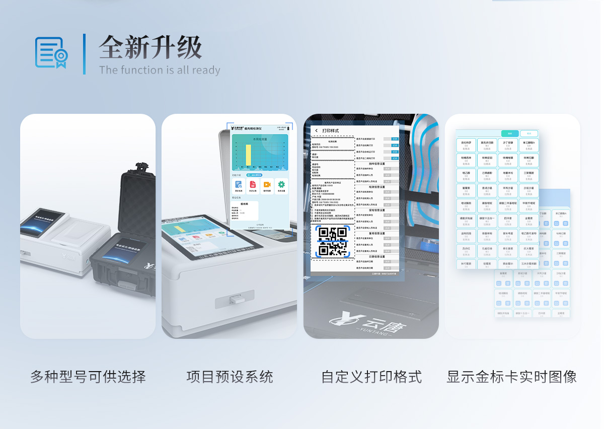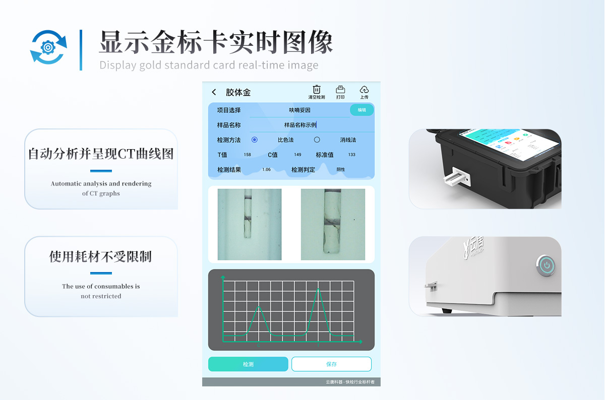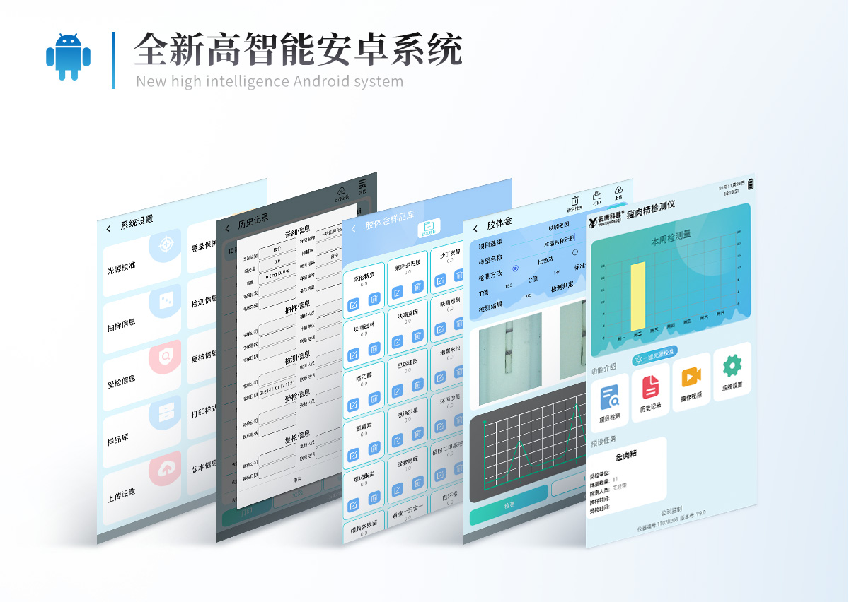 | 1、儀器采用10.1英寸液晶觸摸屏顯,搭配運行安卓智能操作系統,主控芯片采用ARM Cortex-A7,RK3288/4核處理器,主頻1.88Ghz,運轉速度更快速,性能更強。 | 2、儀器功能包括:膠體金檢測模塊、數字化管理模塊、無線通訊模塊等,可以滿足同一軟件下實現所有檢測項目的檢測,并在同一窗口展示檢測結果。 | 3.一體化便攜式快檢設備,采用交直流兩用供電方式,可連接車載電源,配備6ah大容量充電鋰電池,可以滿足現場及流動檢測使用的需求。儀器尺寸:43×35×20cm, 主機凈重:5.1kg | 4、系統自帶數據集成模塊,設備首頁自動統計檢測數據包含:周檢測數據、月檢測數據,全部檢測總數量,均包含檢測總數,合格數,不合格數,以及相關柱形分析圖,對各項檢測數據清晰掌握,無需電腦查詢,更加快捷直觀。 | 5、儀器具有任務預設模塊,可在樣品送檢前提前預設樣品名稱、檢測指標、送檢單位等信息,樣品送檢時一鍵調取保存信息,檢測更加方便快捷。 | 6、膠體金檢測模塊: | 軌道式自動傳輸掃描方式,可實時顯示金標卡實時圖像,系統自動分析并呈現出CT曲線圖,CT線自動識別,無需手動調整,完成檢測后自動退出檢測卡。 | 結果判定線可修改,對照值標定值可保存,斷電不丟失數據。 | 兼容市場上其他膠體金卡,使用耗材不受限制,極大增強用戶使用體驗。 | 7、儀器檢測系統擁有龐大數據庫,并且構建了完善的檢索、修訂功能。食品庫涵蓋多種樣品名稱,可按需添加或刪除、編輯樣品名稱;產品數據庫以及歷史檢測記錄支持一鍵檢索功能。 | 8、系統打印自定義化,打印格式多樣化,產品合格證(國家標準要求),二維碼,抽樣信息、檢測信息,受檢信息、復核信息、抽樣日期、檢測日期等信息結果,可按需求自行設置打印內容。 | 9、A4紙版本報告打印功能(可選配):設備擁有兩種結果展示方式,可以自動生成A4打印模板和小票打印模板兩種樣式,可通過WiFi及網線等方式鏈接外置打印機可進行打印 | 10、儀器具有 wifi 聯網上傳、RJ45網線連接功能,可以快速上傳數據。同步對接監管平臺,數據可局域網和互聯網數據上傳,檢測結果直接傳至食品安全監管平臺。進行區域食品安全監管及大數據分析處理與數據統計,檢測區域食品安全長短期動態,達到食品安全問題預估、預警。 | 11、設備支持U盤存儲,標準USB接口,免驅動安裝。檢測結果存儲容量20萬條以上,可生成Excel表格,進行一鍵拷貝,并具有登錄保護功能,可設置用戶名及密碼,規范不同人員操作權限,防止非工作人員操作,并且可以進行重新校準、鎖定、恢復出廠設置功能。儀器固件可升級,后期檢測項目可擴充。 | 12、儀器具備遠程升級功能,可定向分客戶分儀器更新,開機后自動更新,并可持續性免費更新系統版本,無需像傳統產品返廠更新,節省時間及人力成本并避免了物流運輸返廠升級導致設備損壞的潛在風險。 |