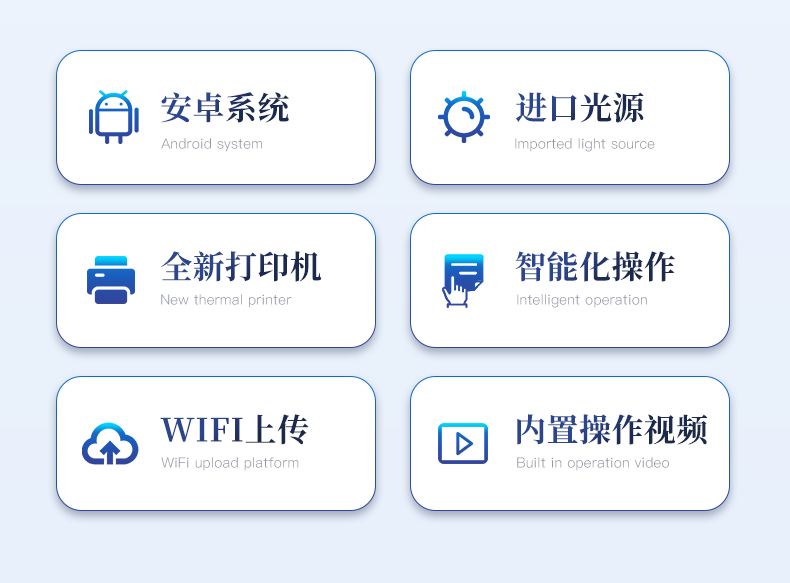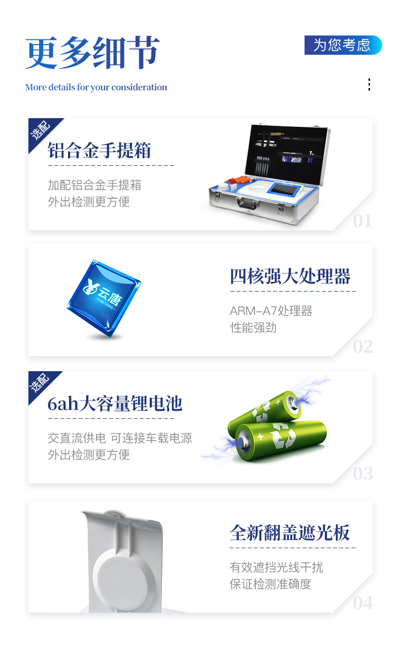 | 主控芯片采用ARM Cortex-A7,RK3288/4核處理器,主頻1.88Ghz,運轉速度更快速,穩定性更強。 | 顯示方式:7英寸液晶觸摸屏顯示,人性化中文操作界面,讀數直觀、簡單。 | 直流12V供電,可連接車載電源,可配6ah大容量充電鋰電池,方便戶外流動測試。 | 雙波長冷光源,每個通道均配置405、528nm波長光源,標配**的光路切換裝置,**光路切換功能可實現*多64波長,并且所有檢測項目可實現所有通道同時檢測。 | 光源亮度自動調節與校準 | 智能恒流穩壓,光強自動校準,長時間連續工作光源無溫漂現象。 | 內置新國家限量標準,與所測結果進行現場比對,并持續更新標準。 | 不間斷進樣,連續檢測 | 樣本編號自動累加 | 檢測項目可擴充。 | 檢測結果可批量打印,批量上傳。 | 檢測結果為Excel表格,連接電腦即可拷貝。 | 支持U盤存儲,標準USB接口,免驅動安裝。 | 可配置大容量鋰電池,固件可升級 |