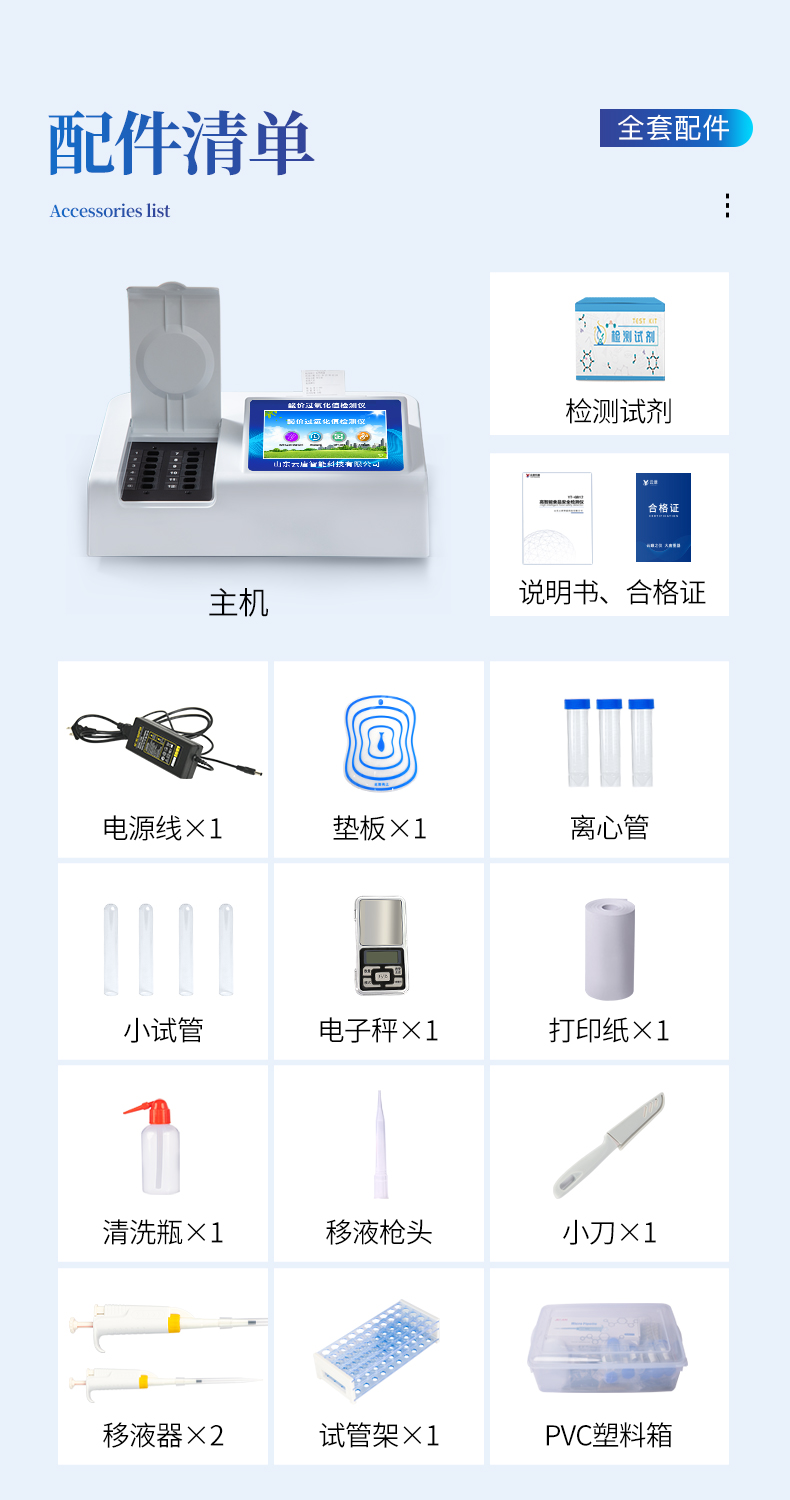 | 安卓智能操作系統,采用更加**和人性化操作,儀器具有網線連接、wifi聯網上傳、GPRS無線遠傳功能,快速上傳數據。 | 一體化便攜式快檢設備,滿足現場及流動檢測使用需求,能夠在同一軟件下實現所有檢測項目的檢測,并可通過同一窗口直觀顯示檢測結果。 | 智能化程度高,儀器具有自檢功能:具有開機自檢和調零功能,具有自動檢測重復性功能。 | 檢測通道:≥12個檢測通道,可以同時測試多個樣品,每個樣品由程序控制分別獨立工作,不會互相干擾。 | 顯示方式:≥8英寸液晶觸摸屏顯示,人性化中文操作界面,讀數直觀、簡單。 | 配備新一代嵌入式熱敏打印機,可選擇手動打印或者自動打印,檢測完成可自動打印檢測報告和二維碼。 | 光源采用進口超高亮發光二極管,高精度、穩定性強、光源可控、可以關掉不使用的光源,功耗更低。 | 采用USB2.0接口設計,方便數據的存貯和移動,并可隨時與計算機直接相連,并且可用計算機控制儀器。實現數據查詢、瀏覽、分析、統計、打印等。 | 儀器具有品類多種類樣品菜單庫,可靈活選擇檢測樣品,不同的檢測通道可同時檢測不同的樣品項目。 | 樣品處理簡單省力,整體操作快速、安全、便捷。 | 儀器具有自身保護功能,可設置用戶名及密碼,防止非工作人員操作等。 | 高靈敏度,高檢測精度,高重復性精度,掃描式高精度光學傳感器。 | 過氧化值檢測儀器具有重新校準、鎖定、恢復出廠設置功能。 | 結果判定線可修改,對照值標定值可保存,斷電不丟失數據。 |
