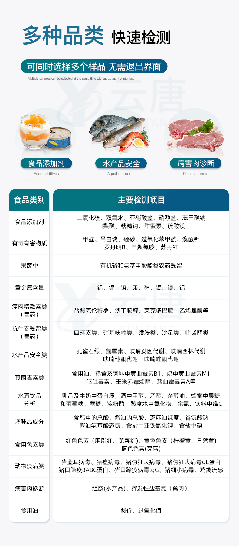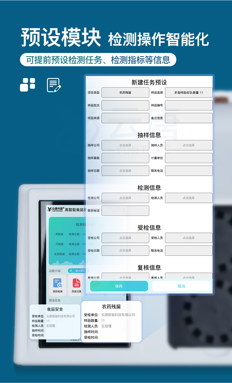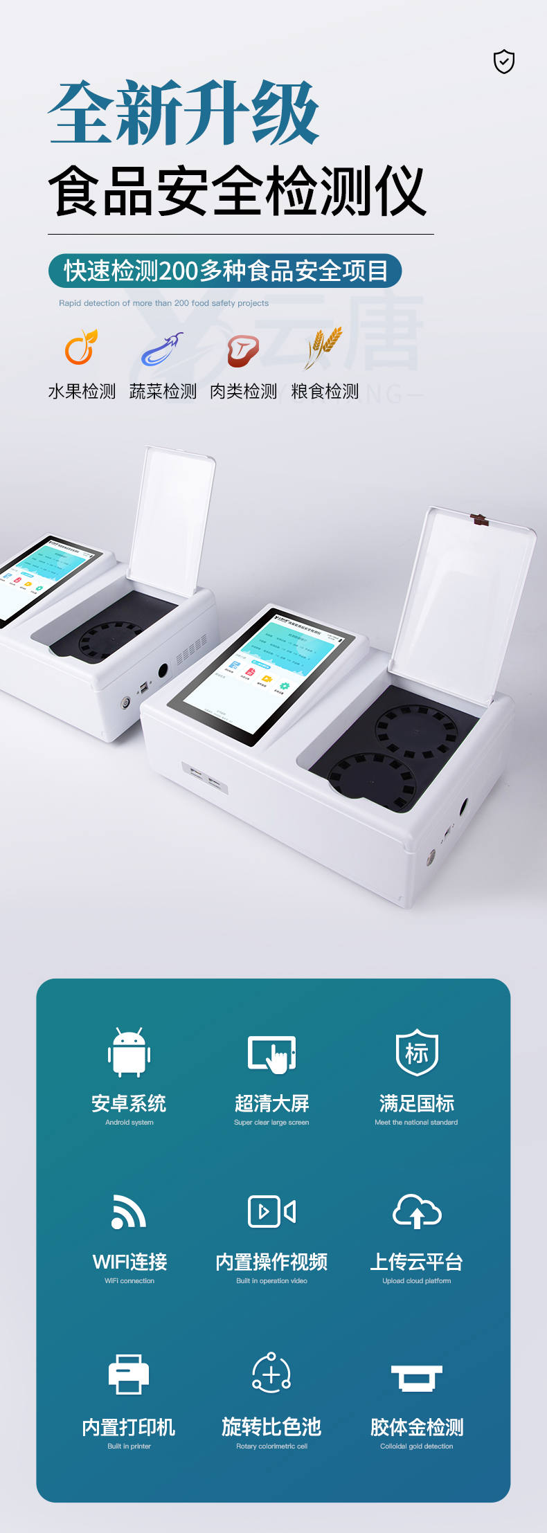 山東云唐智能科技有限公司生產的高智能食品安全檢測儀為集成化食品安全快速檢測分析設備,采用臺式一體化設計,可快速檢測200多種食品安全項目,包含非食用化學物質、濫用食品添加劑、農藥殘留、獸藥殘留、重金屬、病害肉、營養強化劑、抗生素類殘留、激素類殘留、真菌毒素類殘留、化學類殘留等項目的定性定量檢測。