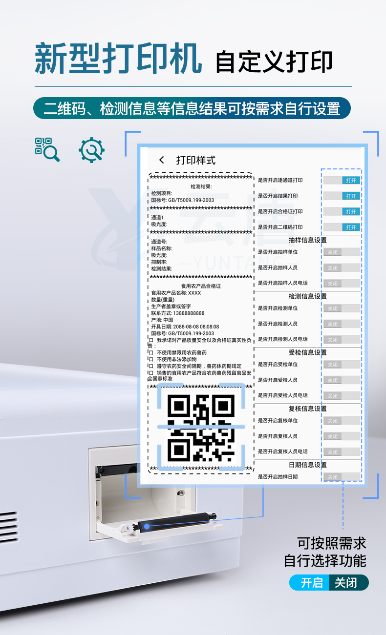 ★自定義打印系統:內置全新打印系統,新創自定義打印方式,可按需靈活設置開啟或關閉:產品合格證(國家農業部標準要求),二維碼,抽樣信息、檢測信息,受檢信息、復核信息、抽樣日期、檢測日期等信息的打印。