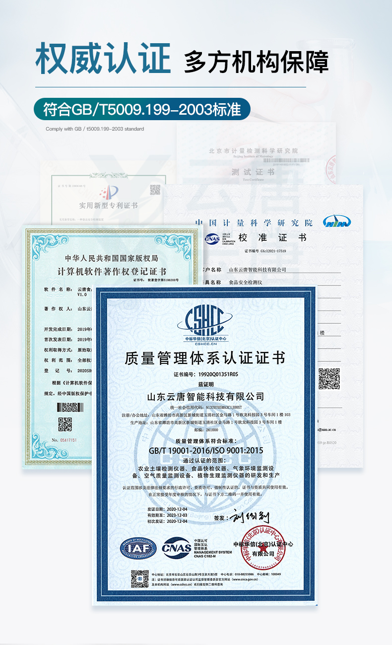 山東云唐智能科技有限公司生產的高智能食品安全檢測儀為集成化食品安全快速檢測分析設備,采用臺式一體化設計,可快速檢測200多種食品安全項目,包含非食用化學物質、濫用食品添加劑、農藥殘留、獸藥殘留、重金屬、病害肉、營養強化劑、抗生素類殘留、激素類殘留、真菌毒素類殘留、化學類殘留等項目的定性定量檢測。