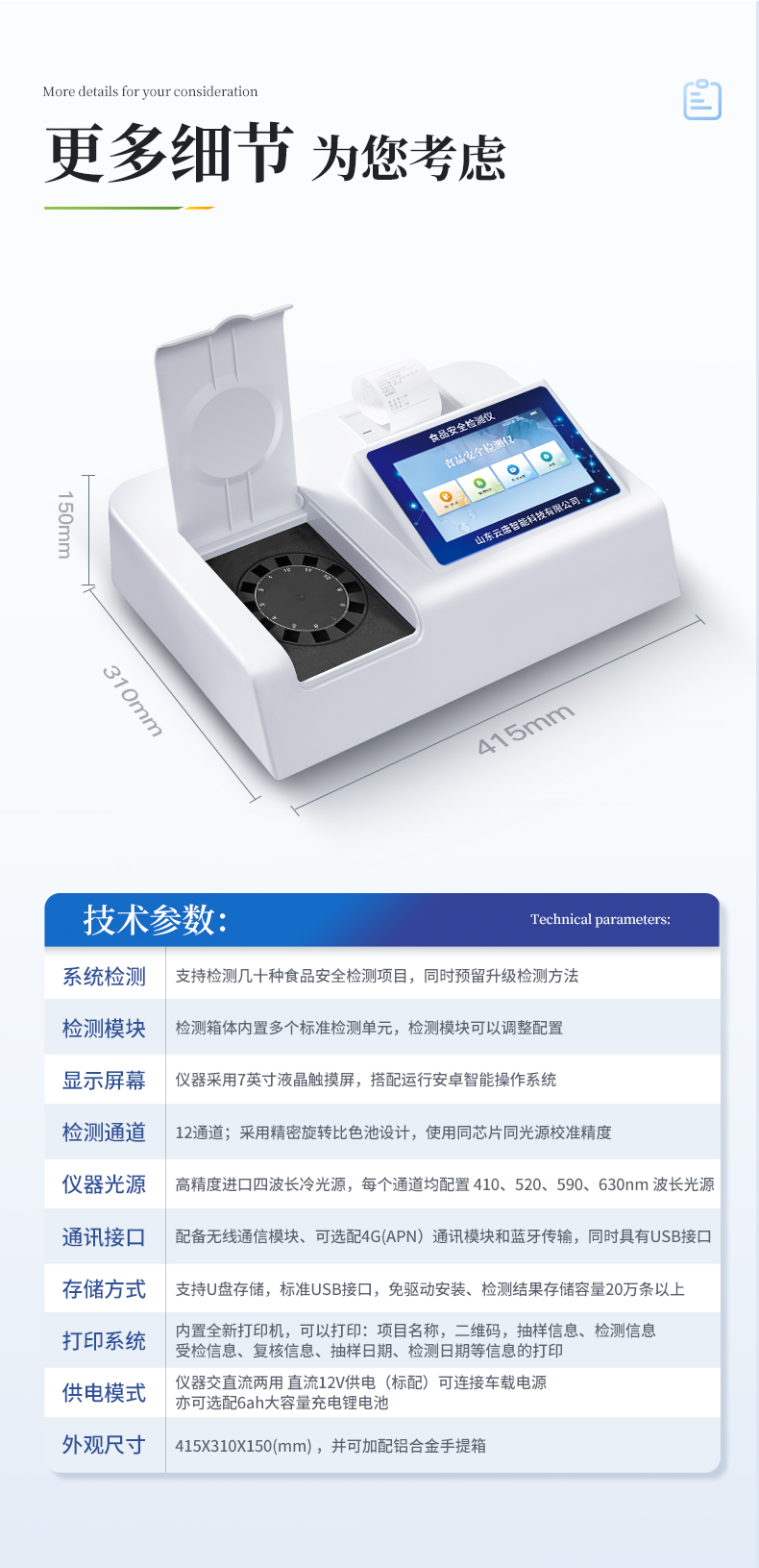 高精度食品安全檢測儀可快速檢測60多項目,包含:濫用食品添加劑、非食用化學物質、農藥殘留、重金屬含量、病害肉成分、營養強化劑、化學類殘留、食用油脂檢測、水酒飲品分析、調味品成分、食用色素等現場的定性定量檢測。