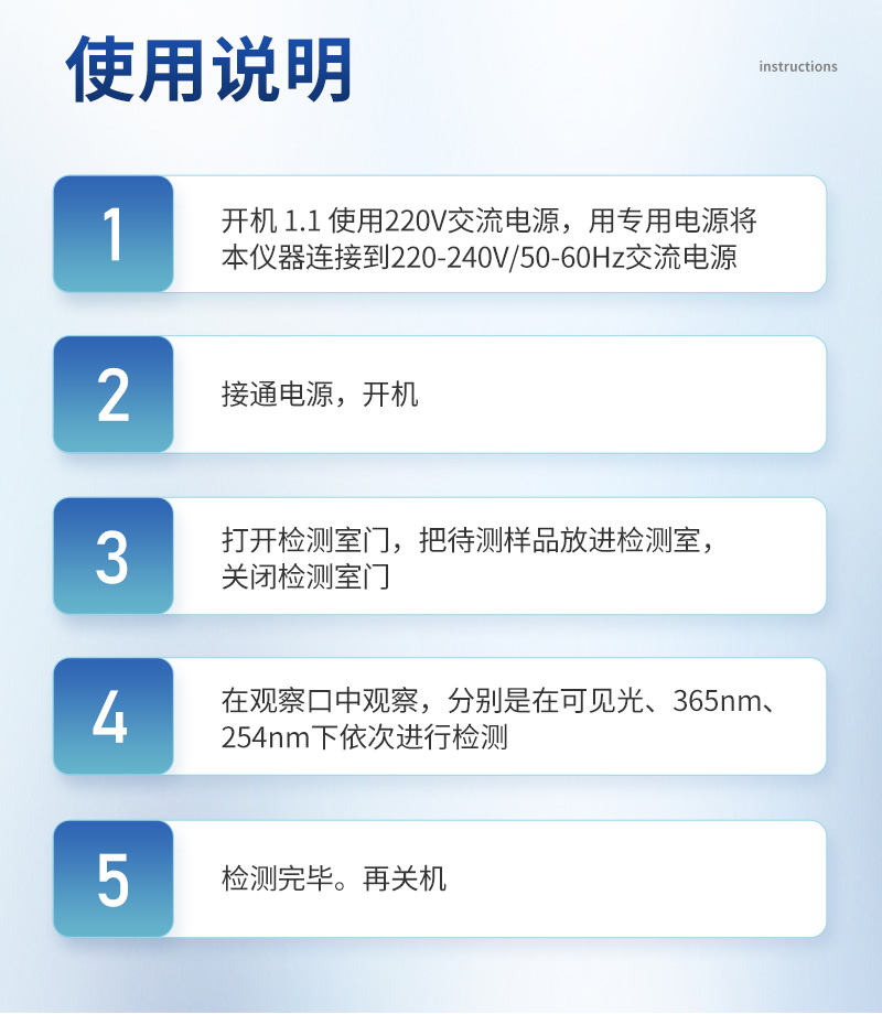 | 1、開機 1.1 使用220V交流電源,用專用電源將本儀器連接到220-240V/50-60Hz交流電源。 | 2、操作程序 | 2.1 接通電源,開機 | 2.2 打開檢測室門,把待測樣品放進檢測室,關閉檢測室門 | 2.3 在觀察口中觀察,分別是在可見光、365nm、254nm下依次進行檢測。 | 2.4 檢測完畢。再關機。 |