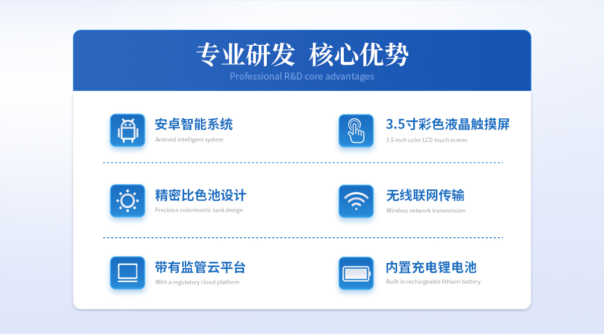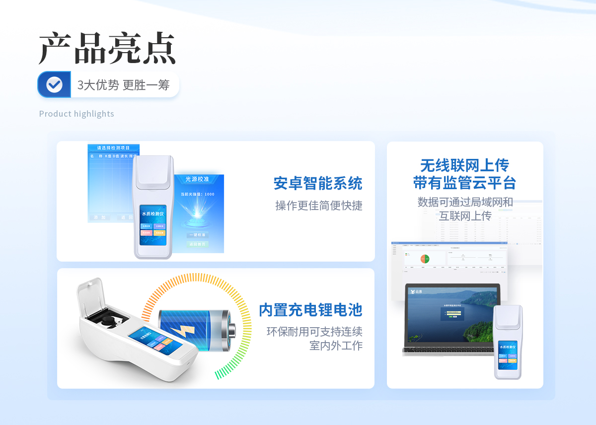 | ①安卓智能系統(tǒng),操作更佳簡便快捷; | ②配置云監(jiān)控平臺(tái),檢測結(jié)果可直接無線傳至平臺(tái),進(jìn)行水質(zhì)長短期分析,輔助管理。 | ③內(nèi)置操作流程、操作簡單、無需培訓(xùn)、直接上手; | ④檢測速度更快,現(xiàn)場讀取數(shù)據(jù); | ⑥便攜式體積小,重量輕,方便戶外檢測; | ⑦外形小巧美觀,工作穩(wěn)定免維護(hù),具有較好的性價(jià)比; | ⑧采用進(jìn)口冷光源,光學(xué)性能穩(wěn)定,壽命長達(dá)10萬小時(shí); | ⑨交直流兩用,內(nèi)置充電鋰電池,環(huán)保耐用可支持連續(xù)室內(nèi)外工作。 |