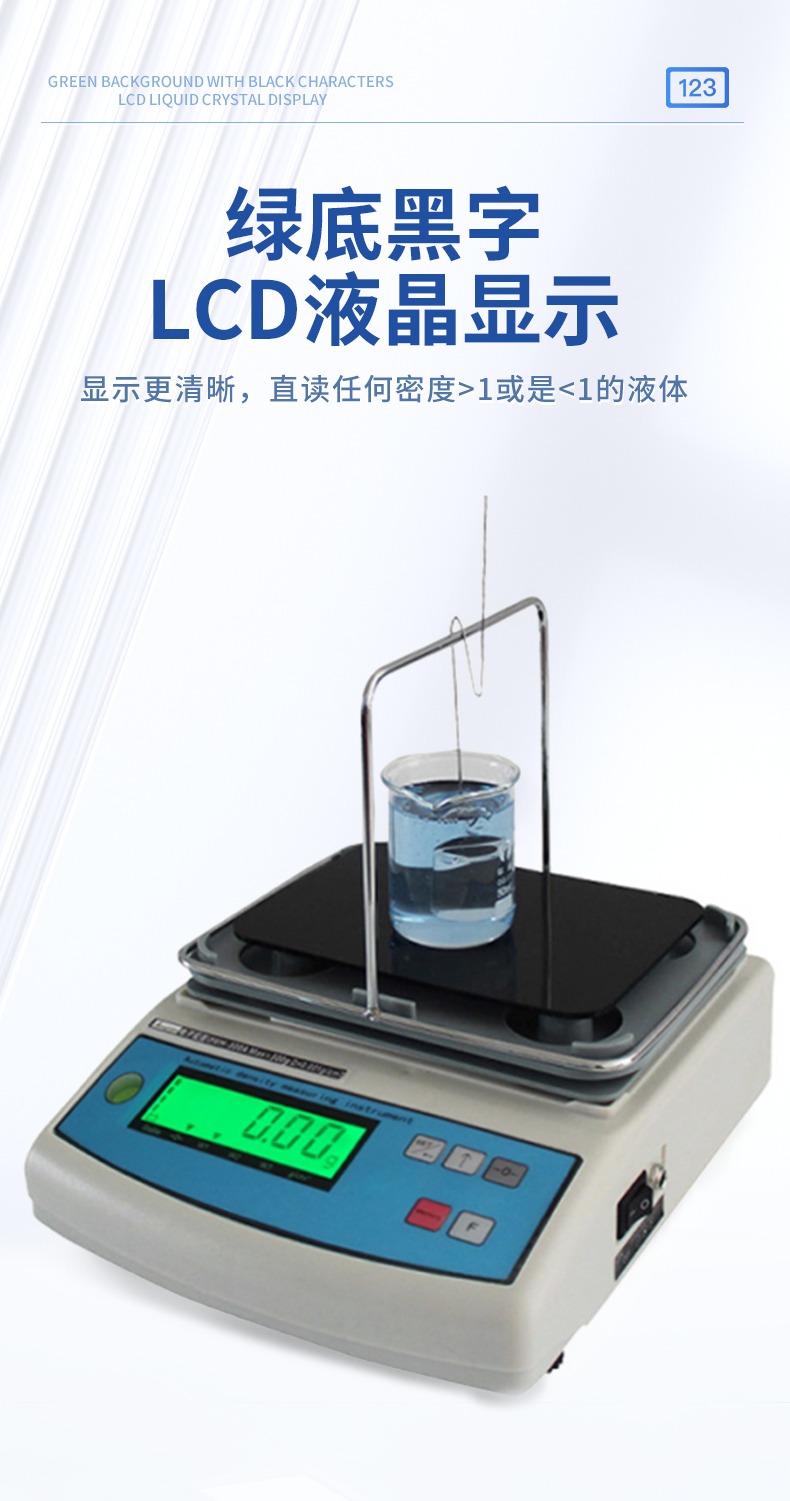 | 1.直讀任何密度>1或是<1的液體. | 2.具有溫度補償設定、溶液補償設定功能,更人性化的操作、更符合現場作業需求 | 3.密度測量臺一體注塑成型,安裝方便快速,使用時間更長. | 4.采用不銹鋼T型架具有極強的耐腐蝕性,專用砝碼掛鉤極大地降低了吊欄線浮力所造成的誤差 | 5.具有密度上、下限功能,可判定待測物的比重合格與否。設有蜂鳴器裝置 | 6.內置蓄電池,選配防風罩,更適合現場測試 | 7. 綠底黑字LCD液晶顯示,顯示更清晰 |