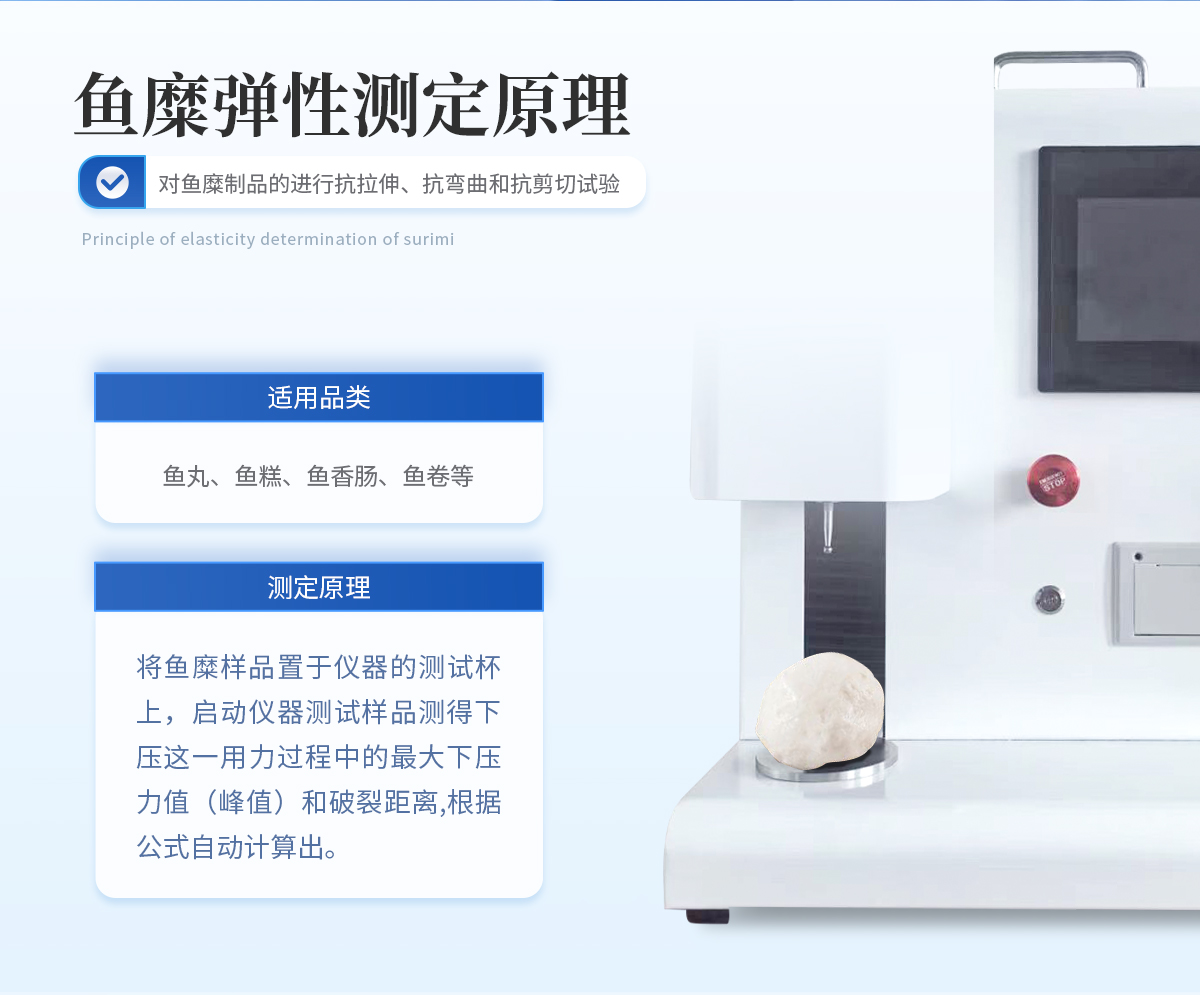 將魚糜樣品置于儀器的測試杯上,啟動儀器測試樣品,測得下壓這一用力過程中的**下壓力值(峰值)和破裂距離,根據(jù)公式自動計算出魚糜彈性值。