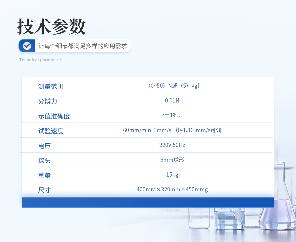 測量范圍:(0~50)N或(5)kgf | 分辨力:0.01N | 示值準(zhǔn)確度:<±1% | 試驗速度:60mm/min 1mm/s (0-1.3)mm/s可調(diào) | 電壓:220V 50Hz | 探頭:5mm球形 | 單位:g.cm | 重量:15kg | 尺寸:400mm×320mm×450mm |