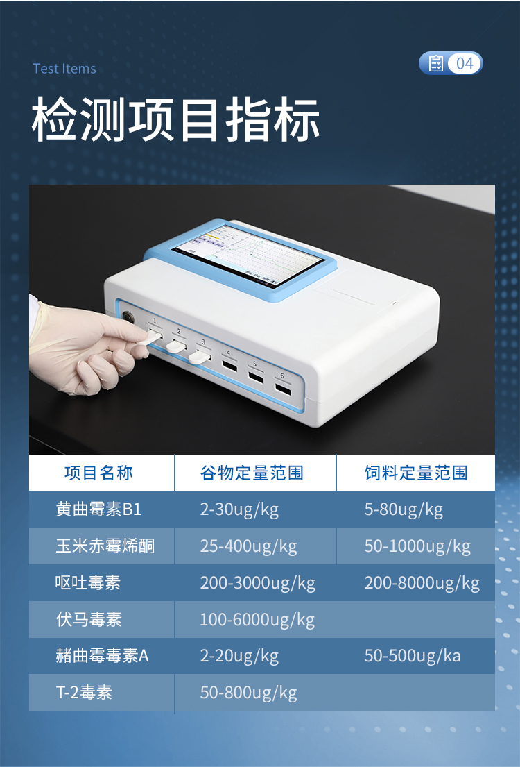 | 重金屬鎘 | 0-1000ug/kg | 玉米、小麥、麥麩、豆粕、花生粕、玉米胚芽粕、膨化玉米、DDGS、噴漿玉米皮及成品飼料 |