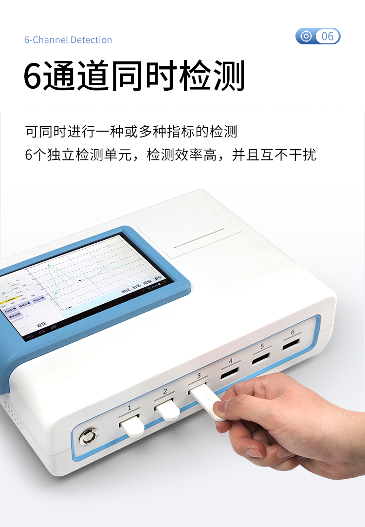 5、6通道設計,可同時進行一種或多種指標的檢測,6個獨立檢測單元,檢測效率高,并且互不干擾;