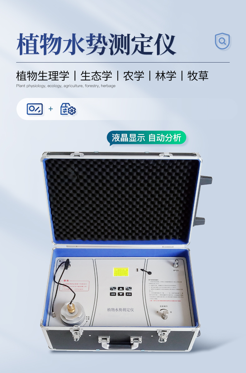植物水勢儀是用于測定植物水份狀況和植物是否需要灌溉分析的一種儀器。可以利用此儀器研究植物的水分關系和植物與環境的關系。適用于植物生理學、生態學、農學、林學及牧草等的研究。據此指導作物及林草的合理用水和抗旱育種等工作,是從事農林教學和科研工作的重要儀器之一。它操作簡便,檢測快速,同時適用于室內和室外及野外測量。